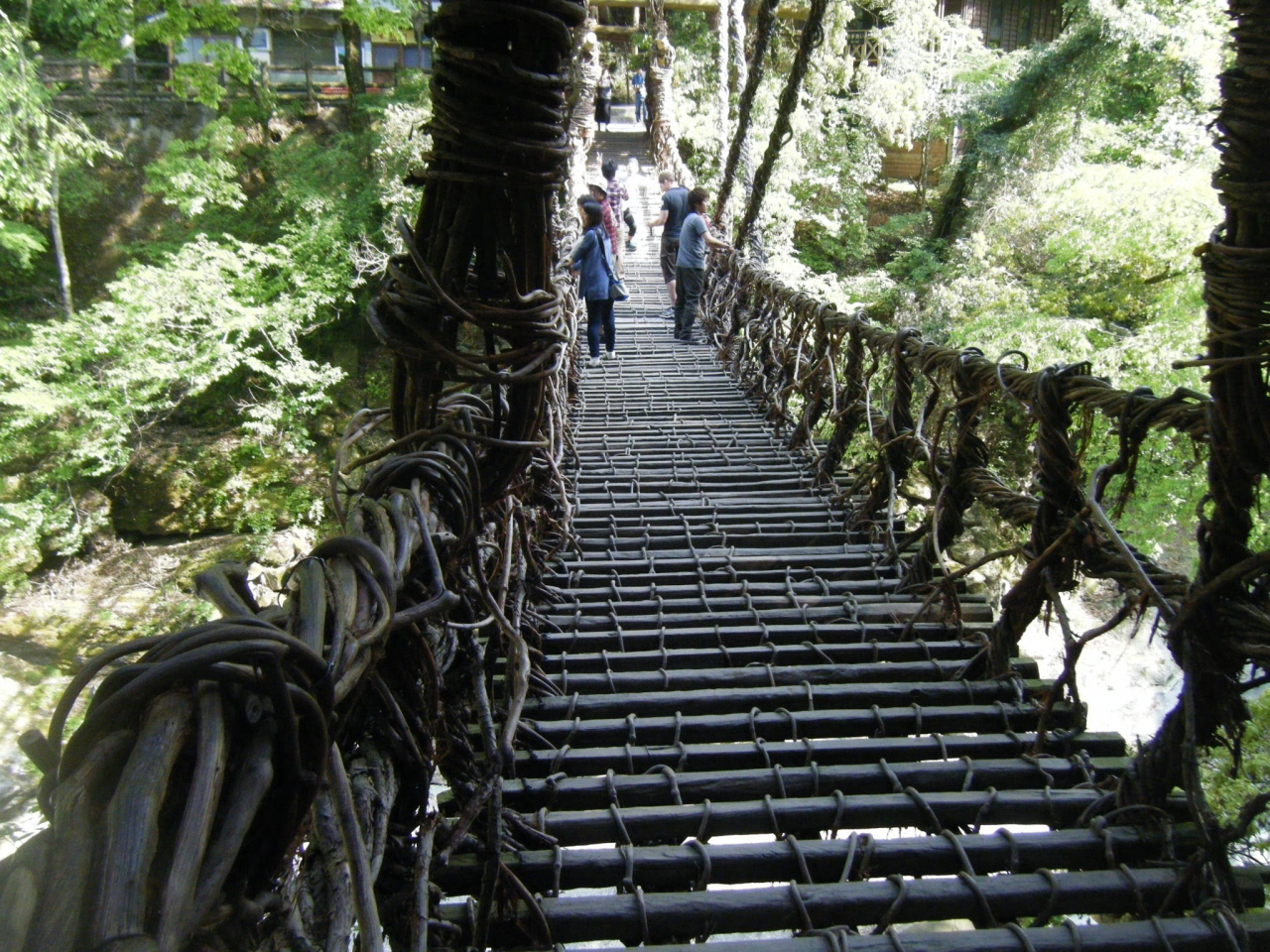 つるで編んでいる吊り橋を500円で渡れます。緑に囲まれた渓谷の景色も綺麗です。ただし、混んでいる時に渡ると、後ろの人のプレッシャーが強く、下だけ見ていそいそ渡ることになるので、みんなが行ったあとにゆっくりわたると楽しめます。もちろん高所恐怖症の方はやめておいたほうが無難です。かなりきしみますし、そこそこ揺れます。