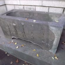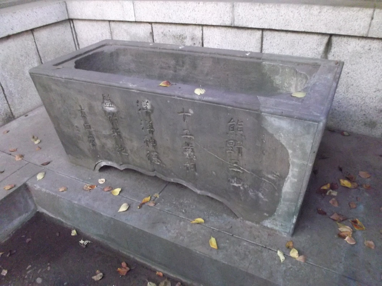 場所は社殿の右袖にこの奥という案内があります。只、石伝いに行くと大島三社(境内社)に突き当たります。あれーと思い横見ると、解説プレートがあり、その先の社殿の裾薄暗い棚の中に畳一畳位の水鉢がひっそりとあります。これが江戸期に奉納されたという文化財です。