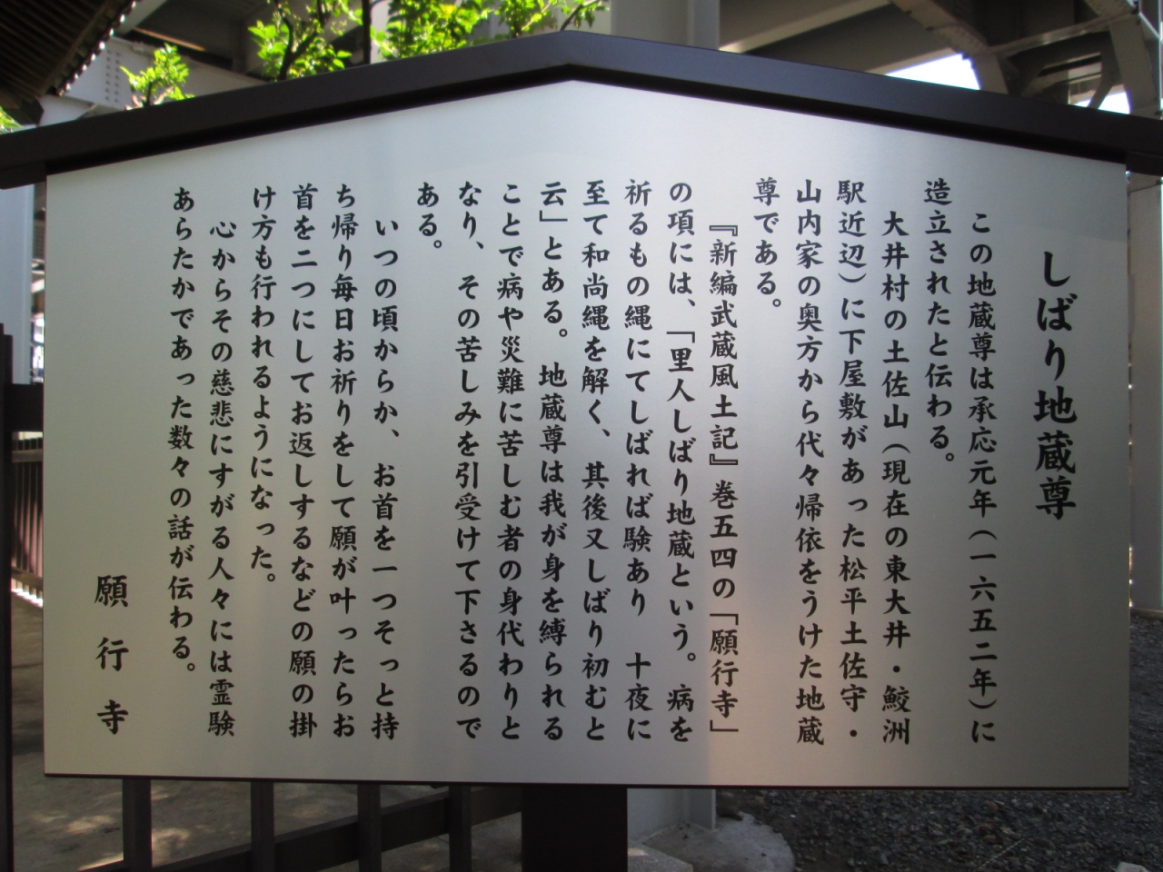 創建1462年の願行寺。境内の一角に地蔵尊があり、「しばられ地蔵」が安置されていました。説明板によると、縄で縛ると、人の苦しみを肩代わりしてくれるお地蔵さんとのこと。願いを掛けたい人が、お地蔵さんの首を持って帰り、願いが叶うと首を2つ持ってくるので、首がたくさん奉納されてました。今でも、風習が残っているかは不明ですけど。