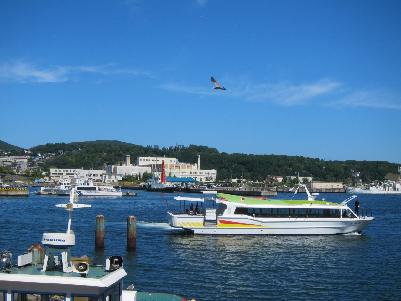 観光船は、小樽運河近くの小樽港3号埠頭から出ています(小樽駅からまっすぐ中央通りを下り、運河を越えてすぐ)。途中、高島岬(日和山灯台)や小樽市にしん御殿、おたる水族館などがある祝津港に立ち寄ります。これらの観光地目当てに祝津港で降りる人、またここから乗る人などもいます。観光船のチケットには、祝津港まで行き、おたる水族館の入場券とセットになったチケットもあります。また、3号埠頭~祝津港はバスで往復した方が安いですが、観光のムードやスケジュール、立ち寄る場所などを考慮して選択すると良いと思います。