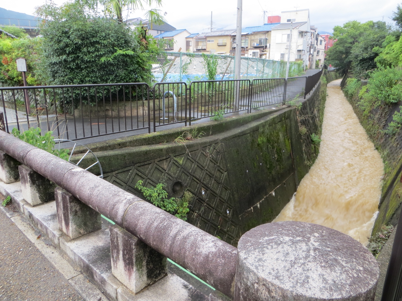 JR嵯峨嵐山の南口から天龍寺へ向かう途中、商店街を抜けた辺りに竜門橋があるのですが、その下を流れる瀬戸川はいつもは綺麗な水が流れていて水量も少ないのですが、先週の台風11号がもたらした大雨によってこれまで見たことがない濁流でした。この川は桂川に流れ込みます。