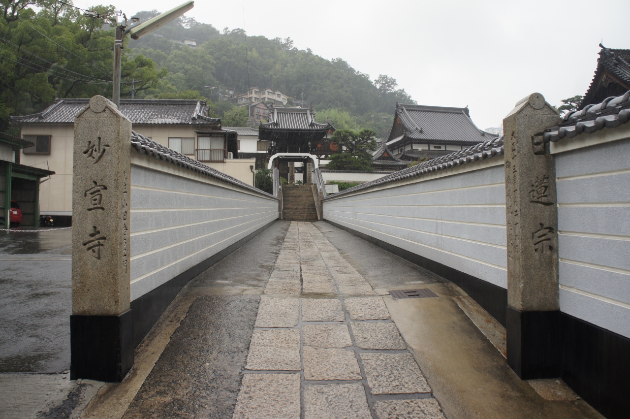 妙宣寺は、1354年に創建された日蓮宗のお寺。長く続く、参道の塀に白い五本の線が入って、これは格式の高さを物語っています。