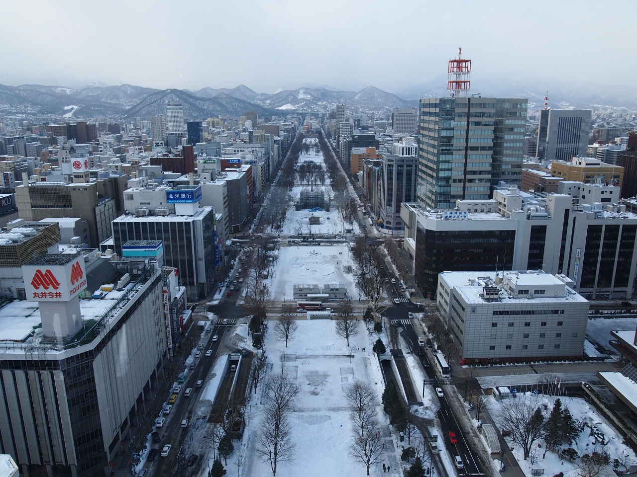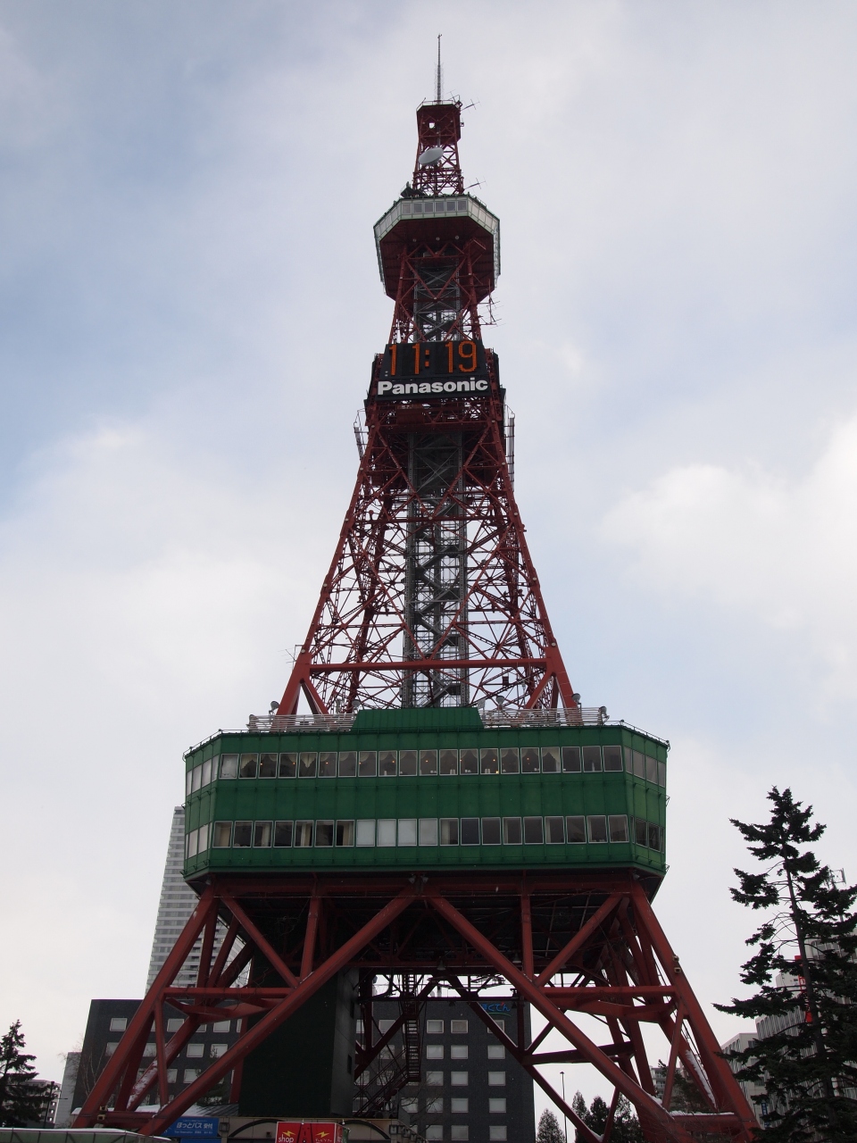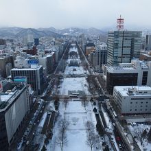 お昼間にはエレベーターで上までのぼり、展望台から大通りを眺めました。