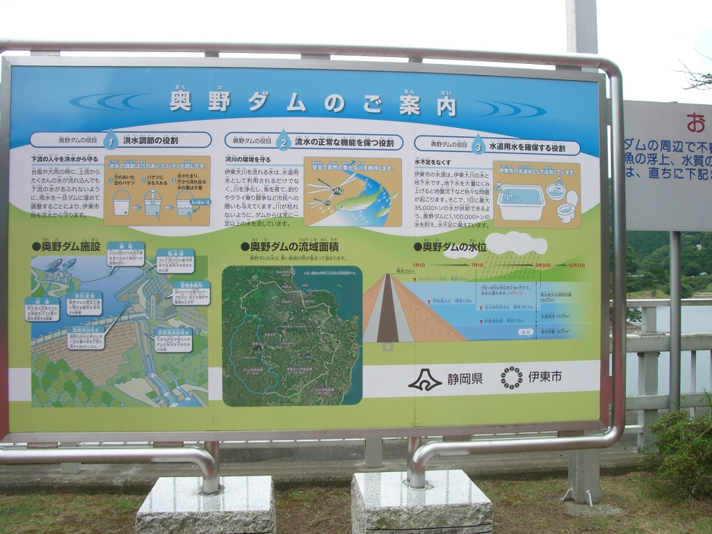 昭和33年の狩野川台風で伊東大川が大洪水となり伊東市に壊滅的な被害を与えた。このため、伊東大川の河川改修が計画されたが、流路延長10kmの内約8kmは山地であるため堤防が建設できないため、治水と水源確保のため、静岡県が建設した多目的ダムである。周囲路はジョギングを楽しむ人がいるくらい環境がよい。
