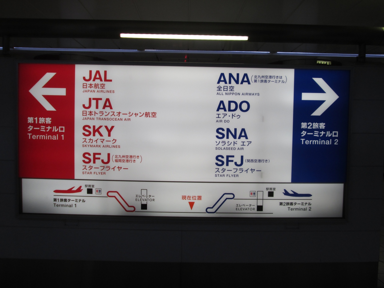 羽田空港国内線ターミナルは2つあり、ターミナル1はJAL系、ターミナル2はANA系となっています。成田空港のJR・京成線の駅、リムジンバスとは違い、京浜急行の駅は1つなので迷いませんが、改札口を確認して降車する必要があります。