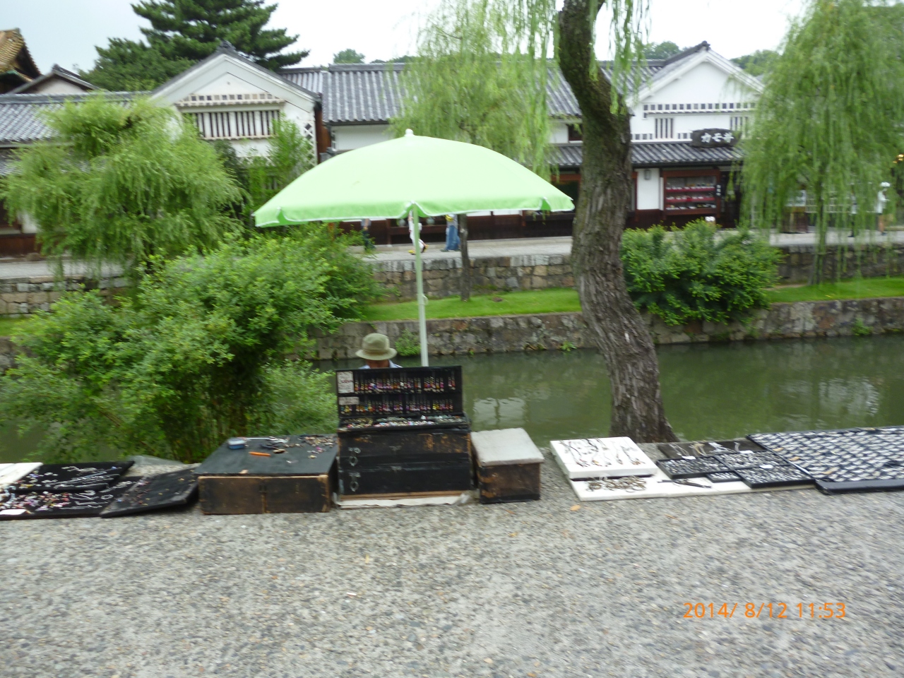 倉敷川を挟んで、慮y側にたくさんの古いお店が並んでいます。