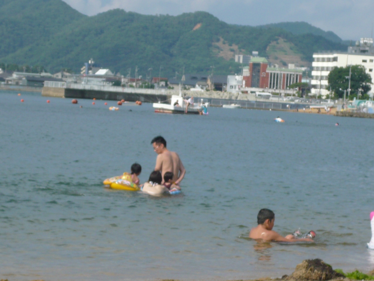 小浜湾内にある人工的につくられた海水浴場です。約300mほどの小さな海岸ですが多くの家族連れで賑わっていました。沖には小さな船が設置されており、そこまで泳いで行き舟に上がり休憩もできます。海水はあまり綺麗とはいえませんが防波堤もあり、波も穏やかです。防波堤では数人が魚釣りをしていました。