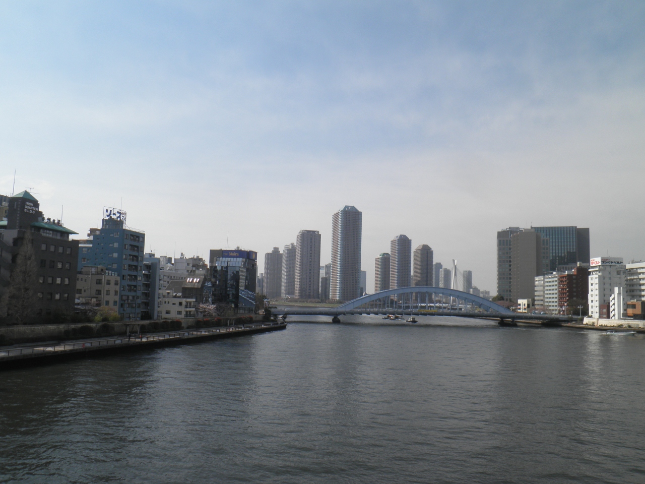 東京を流れる隅田川には、たくさんの橋がかけられています。 永代橋の周辺には高層マンションやオフィスビルなどが立ち並び、特に川が二股に分かれるあたりの景観が都会らしくてよいと思います。ここらへんは川岸に遊歩道も整備されていて散策するのが楽しかったです。