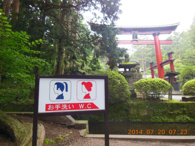 道路から鳥居までは100mほどと思いますが、鳥居に近づくに連れ独特の感じます。トイレの案内板も雰囲気を崩さない配慮がありました。