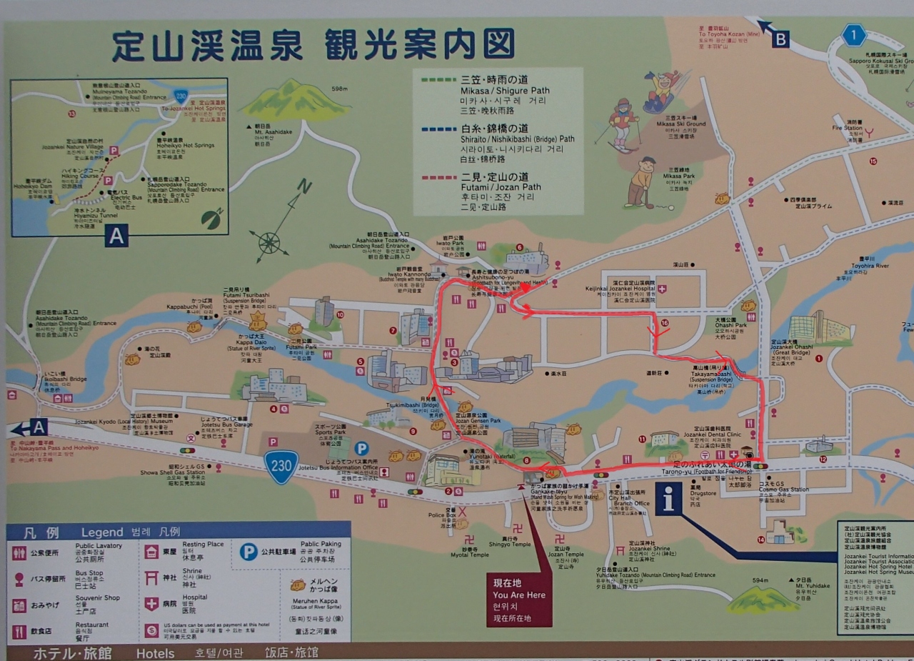 定山渓第一寶亭留 翠山亭~高山橋~太郎の湯~かっぱ家族の願掛け手湯~湯の滝~定山源泉公園~月見橋~足つぼの湯~かんのん坂~定山渓第一寶亭留 翠山亭