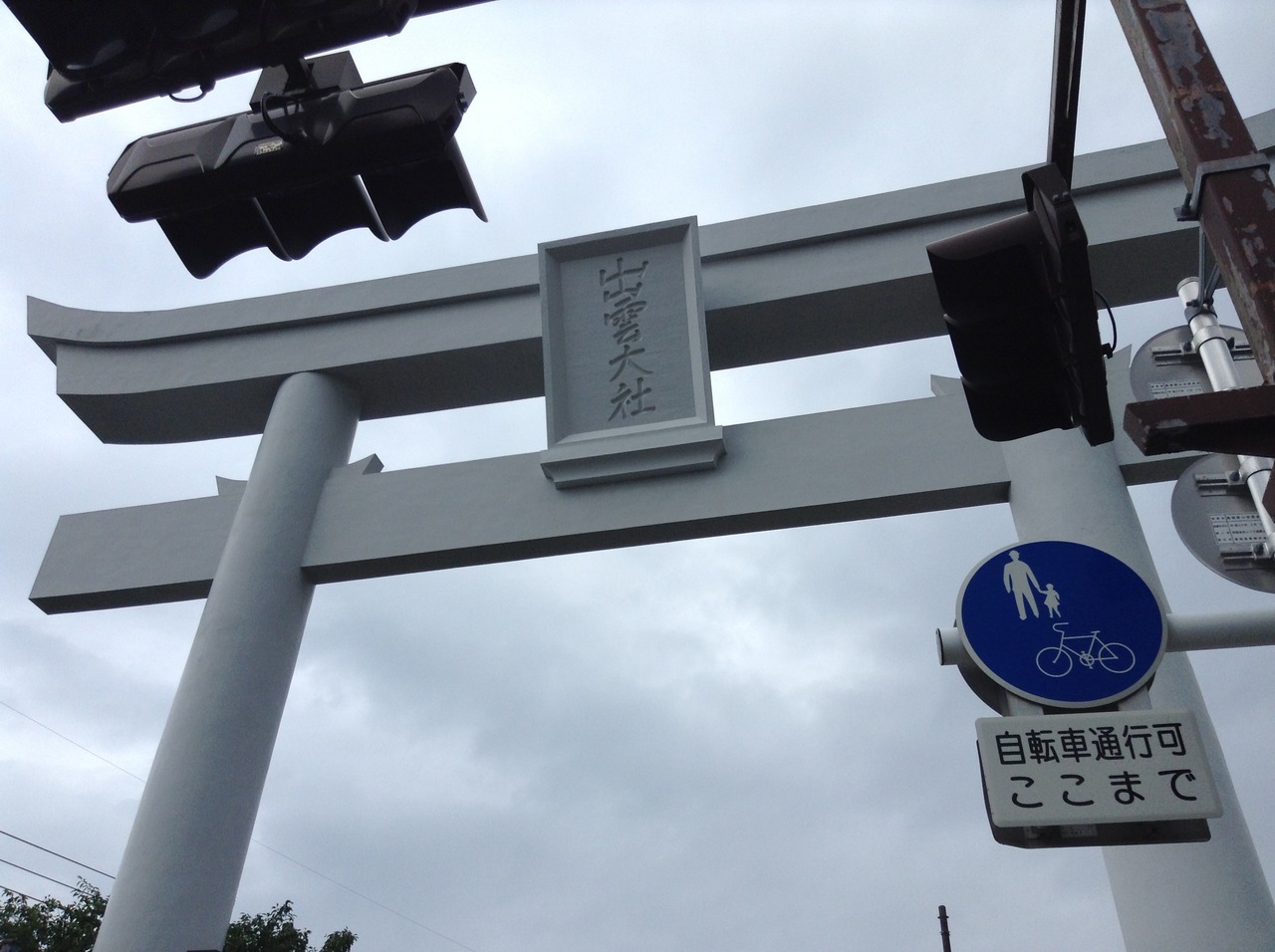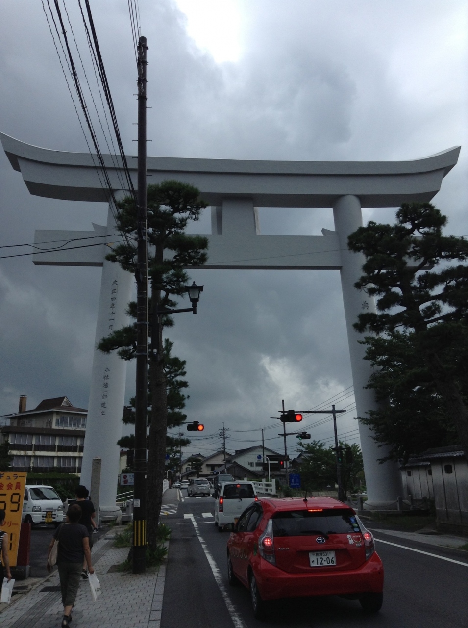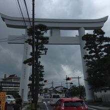 大鳥居は、神門通りの入口、宇迦橋のたもとに建つ大きな鳥居です。かなり離れていても見ることができます。大正4年に北九州市小倉の篤志家により寄進されたもので、鉄筋コンクリート製、高さは出雲大社本殿より少し低い23メートルでかけられた額は、畳6畳敷き分もあるそうです。