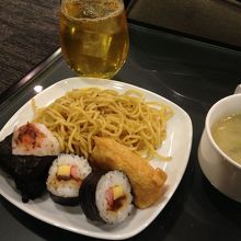 食事内容は巻き寿司、いなり寿司、塩焼きそばくらいですね。