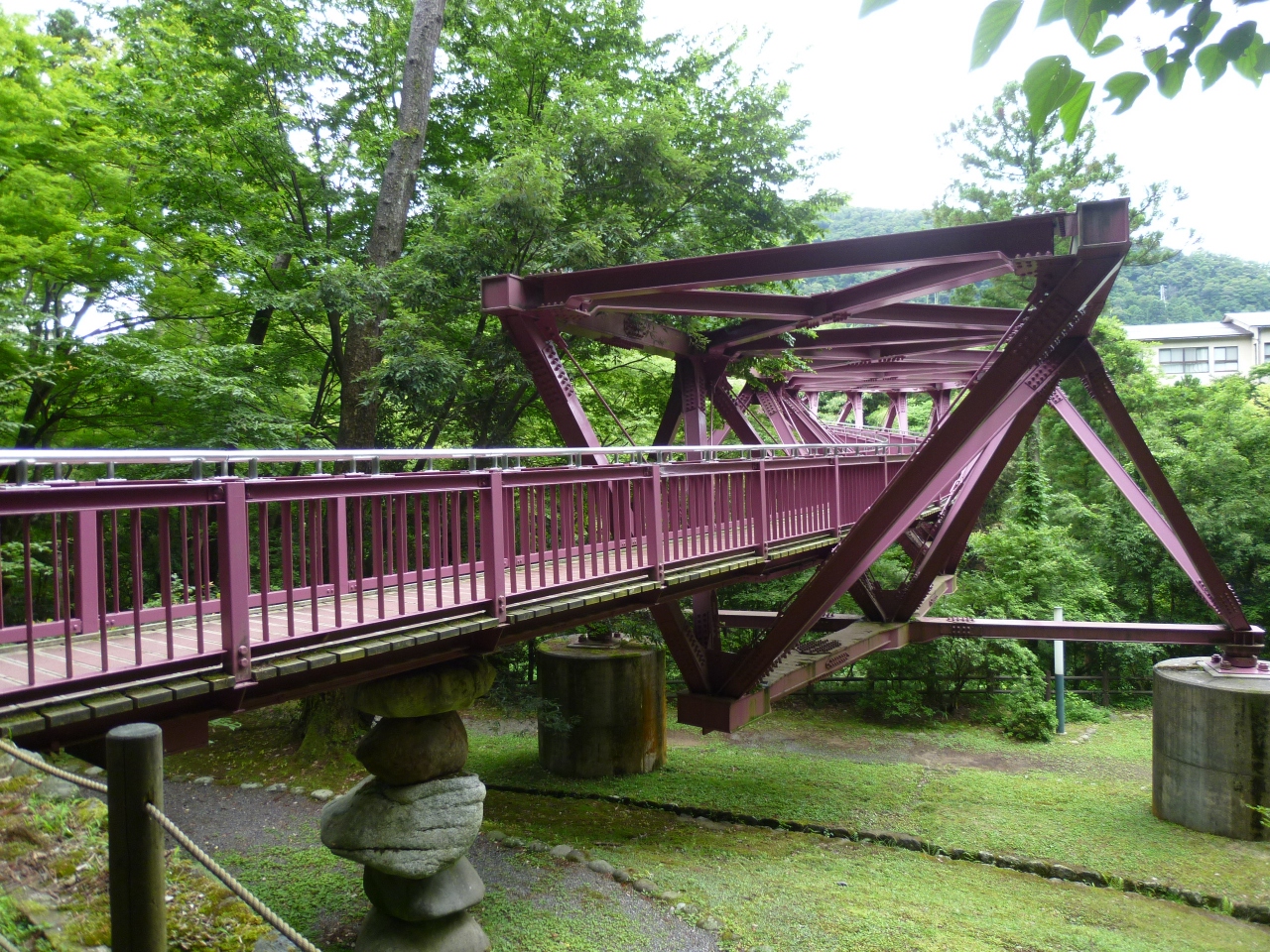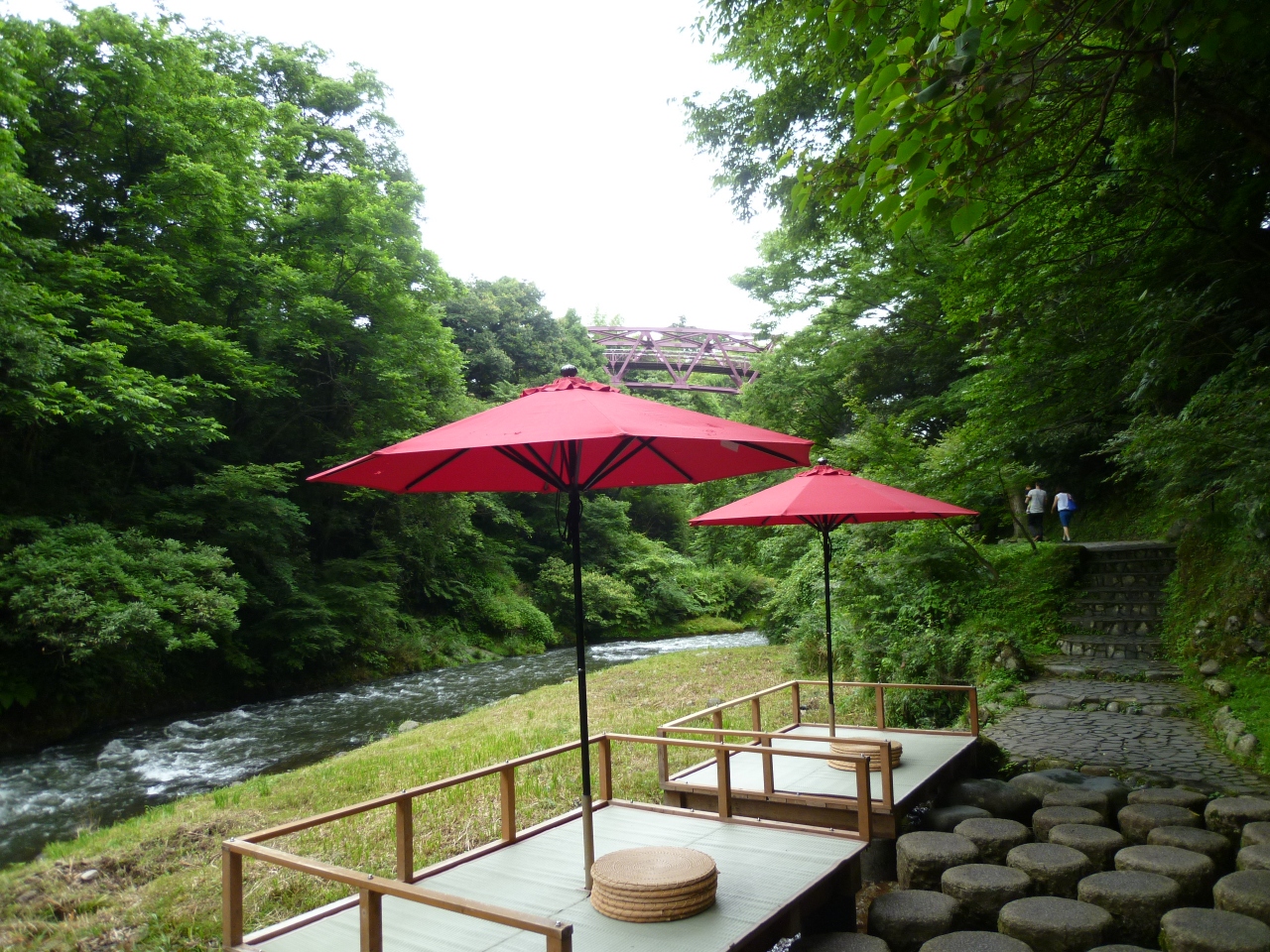 約3時間の行程です。見所は奇妙な形をした「あやとりばし」「川床」「こおろぎばし」など、ところどころに見所があり楽しく散歩できました。ゆげ街道では「夫婦箸」を購入しました。