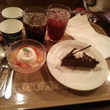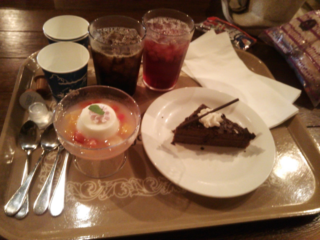 娘と二人で、ゼリーとチョコレートケーキ、アイスコーヒー、グレープジュースを買いました。