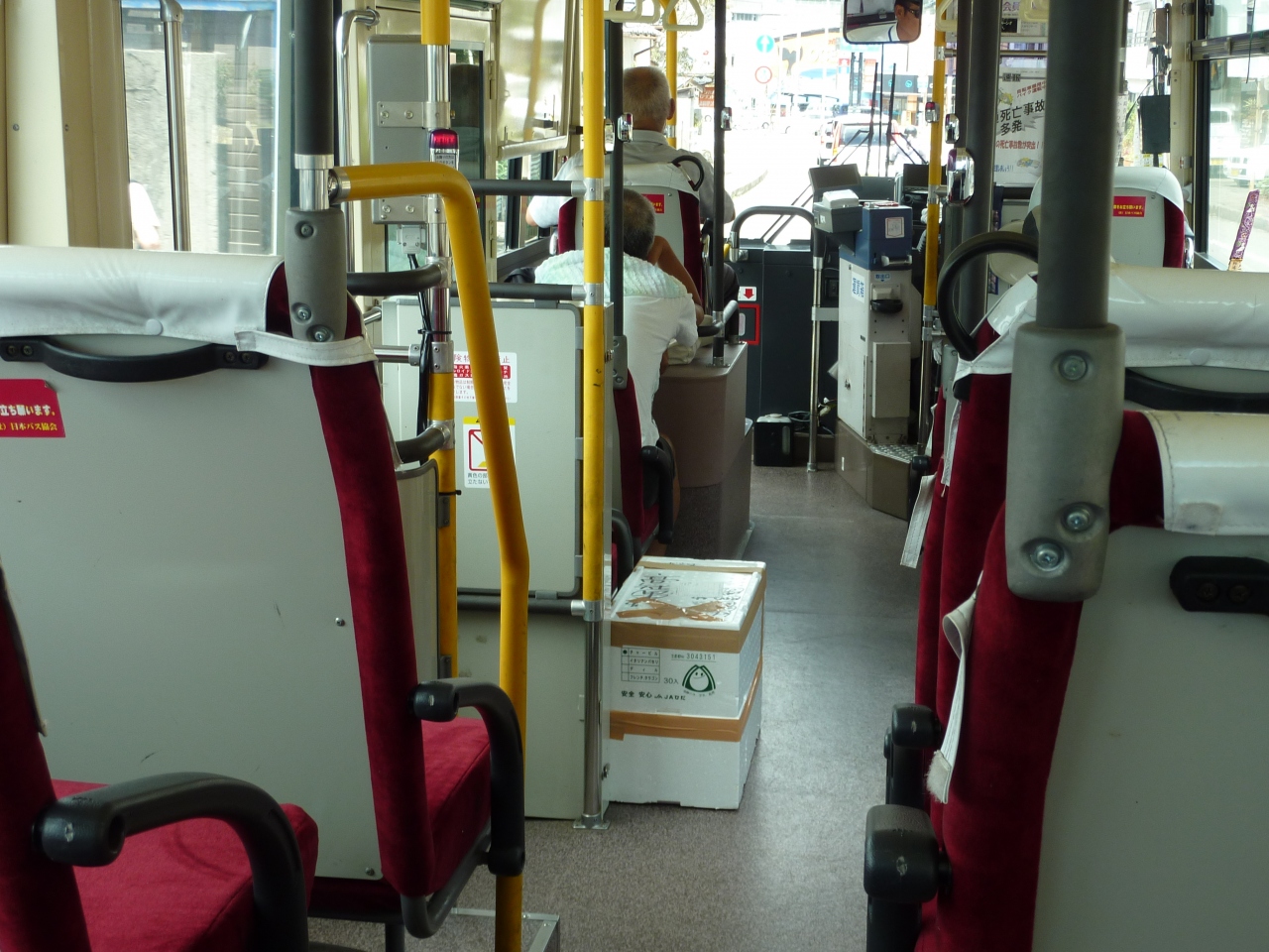 東部交通の長距離一般道路線、甲浦駅前から室戸岬を経由して奈半利駅前まで乗車しました。運賃は2500円弱です。時間にして2時間近くかかりますが、運転手さんは室戸で交代します。トイレ休憩などありませんので、通して乗る場合は事前に必ず済ませてください。ところでこの会社の運転手さんはサングラスにガムを噛んでと、南国らしいのですが、本州ではあまり見られない光景で、びっくりしましたが、高知ではありなのでしょうか。でも、運転は安全なので落ちついて乗っていられます。途中で室戸高校へ寄るために、来た道を戻ったり知らないでいるとびっくりもしますが、地域に密着した路線ならではでしょう。乗客もコンスタントにいて利用されています。最後に室戸市内のある停留所で、魚が入った発泡スチロールが2箱載せられました。鮮魚列車ならぬ鮮魚バスですね。