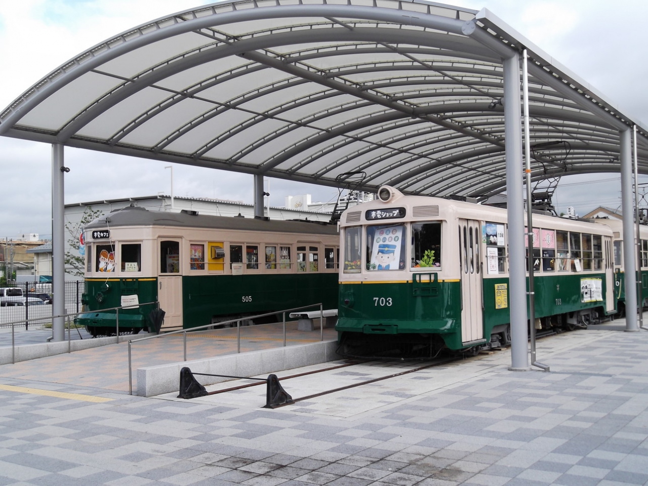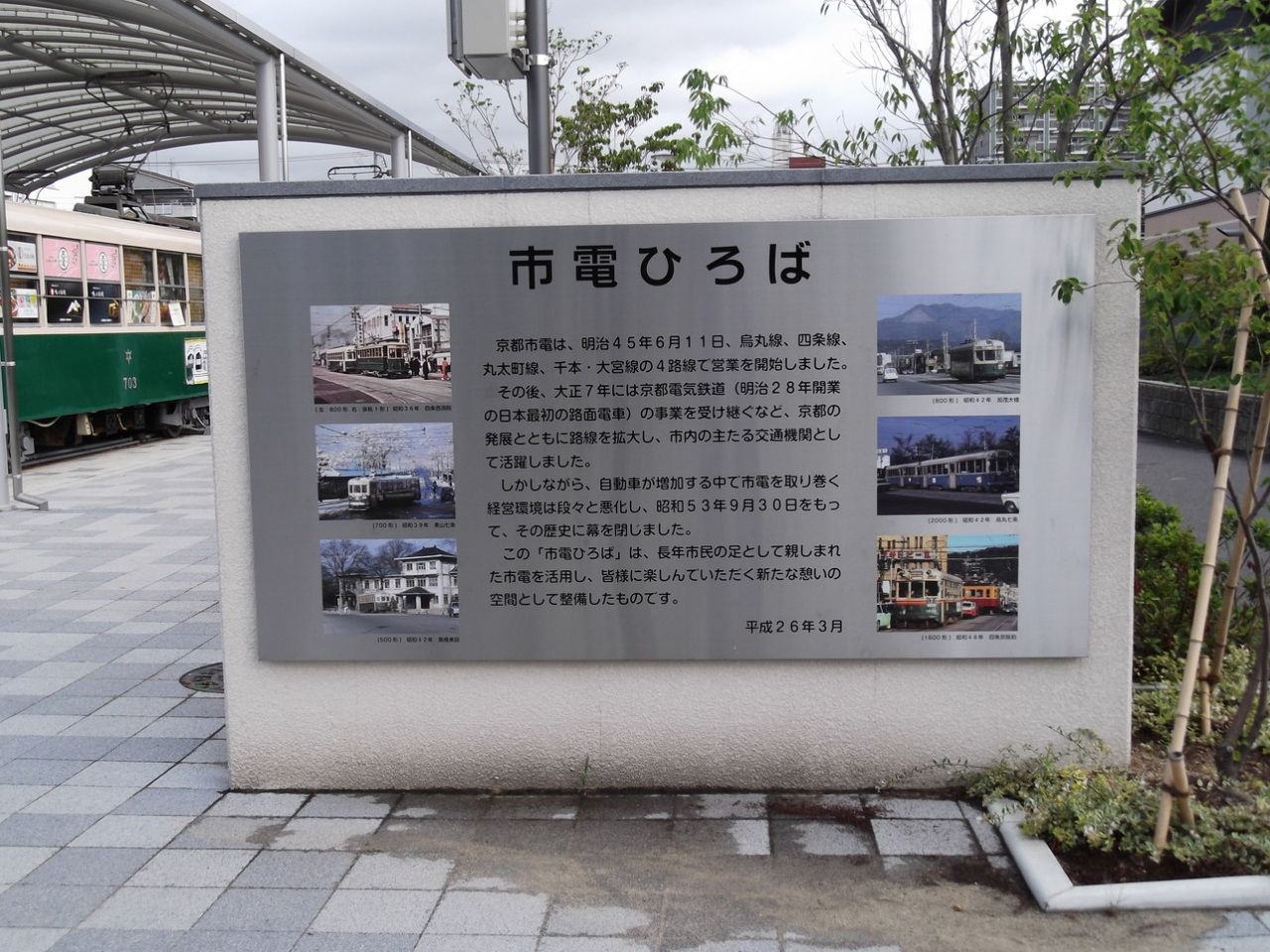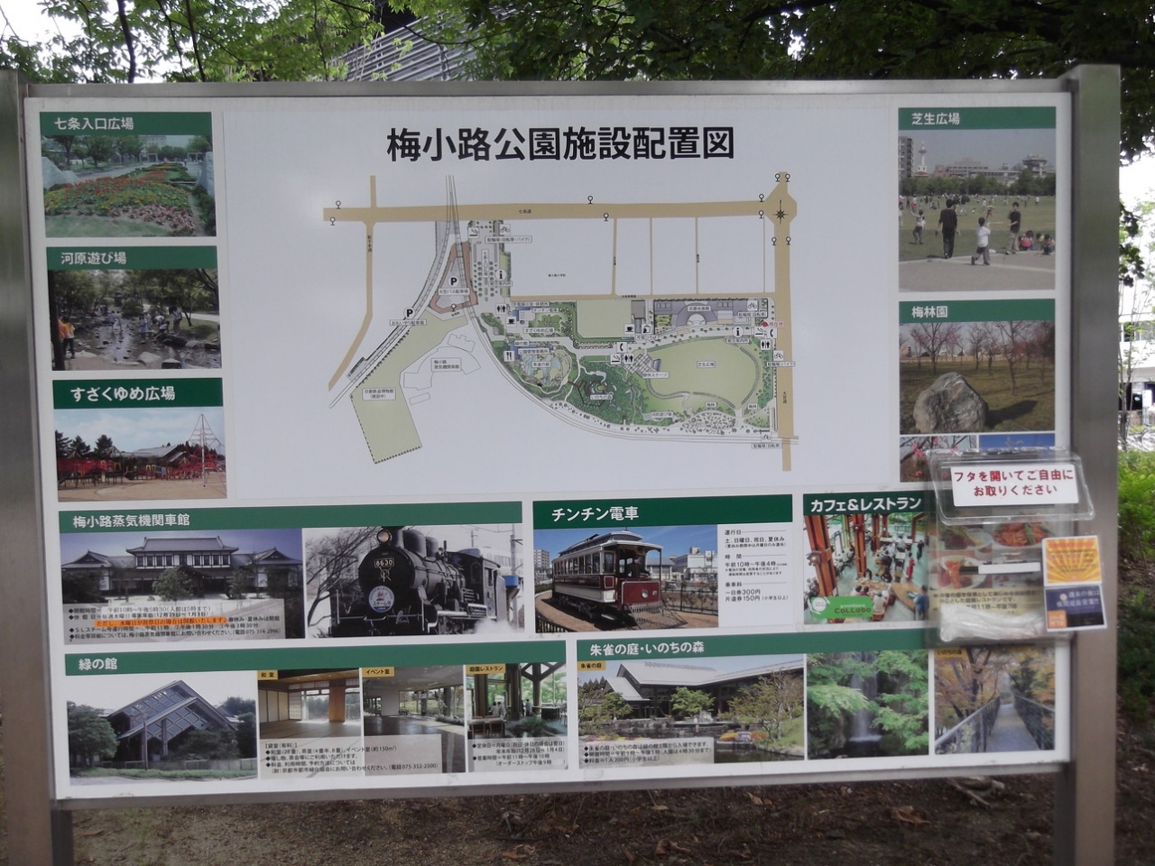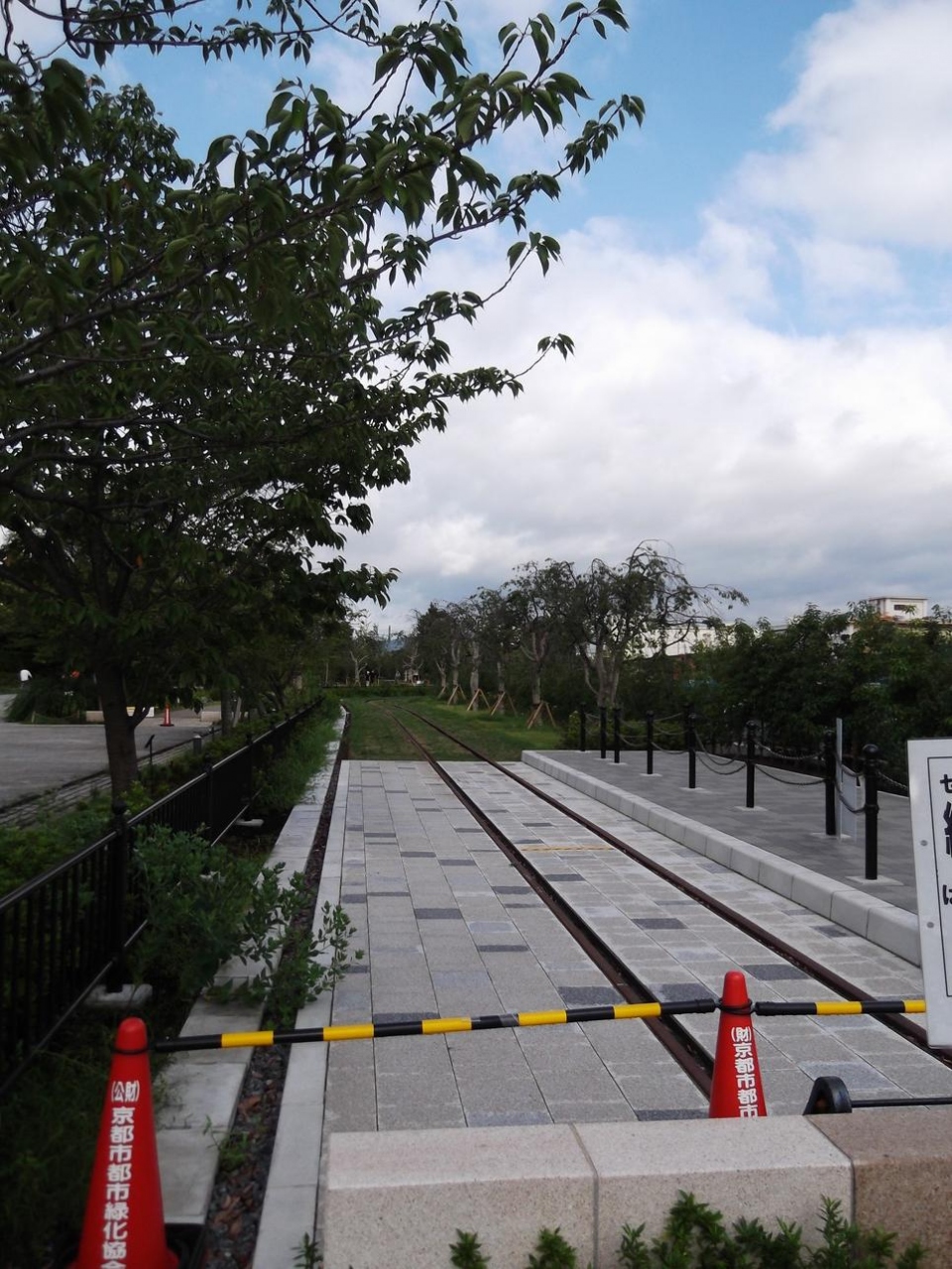 JR線に沿って水族館から機関車館までをつなぐような形で公園が作られていました。入った時は単なる公園に思えたのですが、むしろ京都市電を展示している公園と言った方がいいのかもしれません。展示されている市電が2両、お店屋さんに変身してしまった車両が4両、100m位を走る車両が車庫に入っていたみたいです。