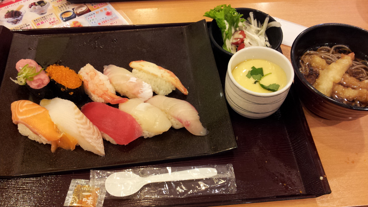800円位のセットを頼みましたが、お寿司が10カンにえび天ぷらののったお蕎麦にサラダに茶碗蒸しも付いてきました。