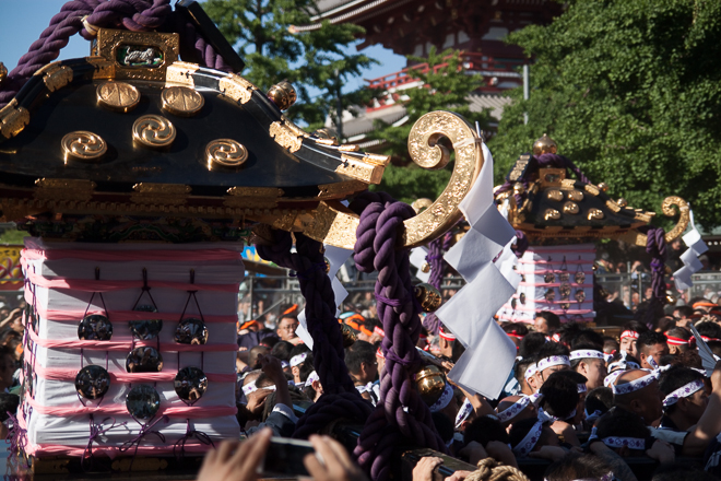 友人の引きがあって、本来は担ぎ手しか入れてもらえない浅草寺境内で三社祭見学させてもらいました。早朝5時台から大勢の担ぎ手が続々と集まり、殺気立つ雰囲気の中での勇壮なお祭りです。人人人の中神輿がうねる様子は素晴らしいの一語に尽きました。