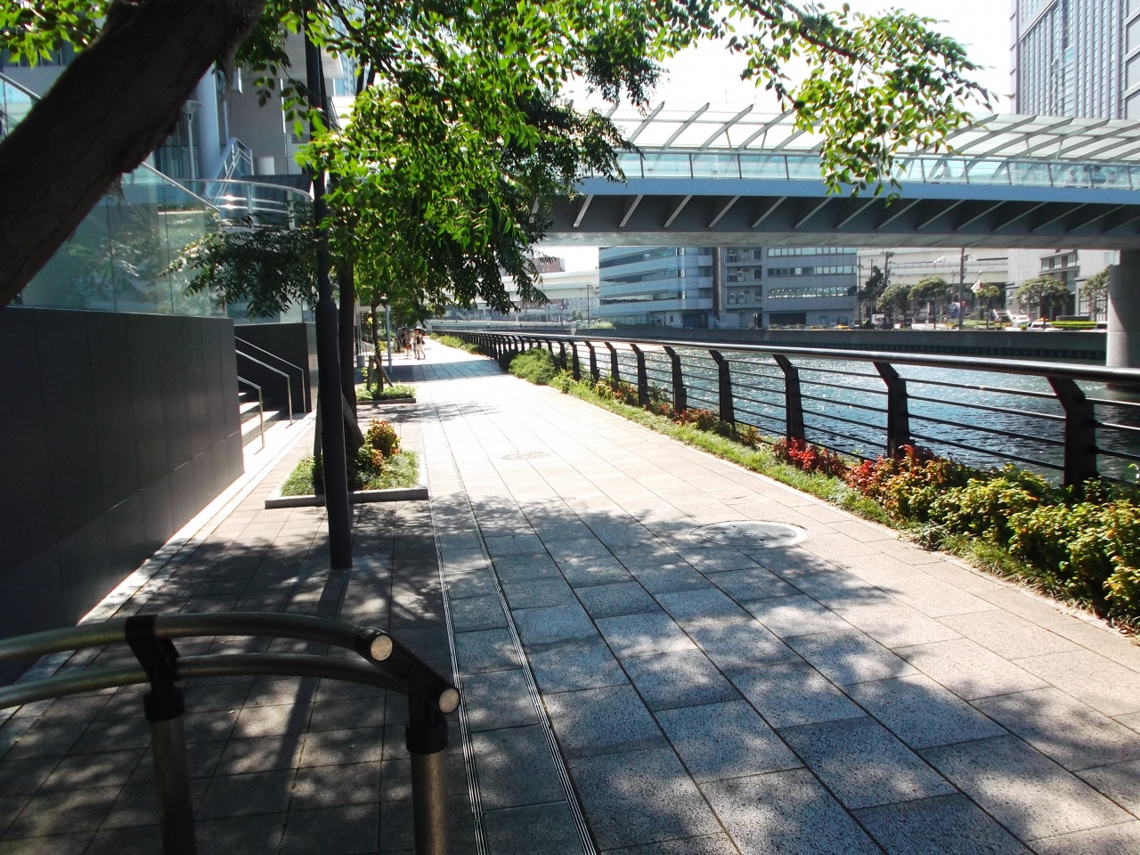 横浜駅に近い帷子川辺の遊歩道です。国道1号線築地橋下からみなとみらい大橋下・高島水際線公園西側エントランスゾーンに至る歩行者専用道。横浜三井ビル(原鉄道模型博物館)・日産グローバル本社ビル(日産グローバル本社ギャラリー)の下(脇∨裏)を通るかたちです。日産グローバル本社のところはカフェテラス(スタバ)の前を通ります。ここのあたりから見る横浜ベイクォーターの景観・運河とビル群、なかなかいいものです。真夏のこの日、午後に歩きました。ビルの日陰になり(時間帯によるでしょうが)、とても気持ちがよかったです。距離はわずかです(調べていませんが300米位か)。