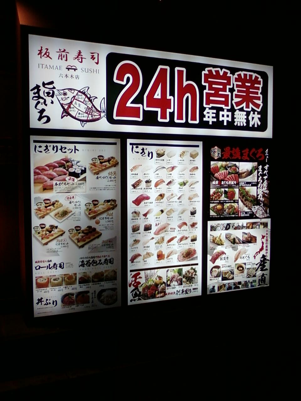 ここの板前寿司は、六本木交差点から二分くらいのところにあります。さすが眠らない町六本木にふさわしく、24時間営業の寿司屋さんです。港区に何軒かあるお店ですが、どこも人気があっておいしいです。寿司ネタの種類が多いのと、新鮮なのが良いですね。そのほかにも英語表記が外国人には助かります。