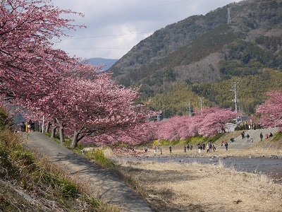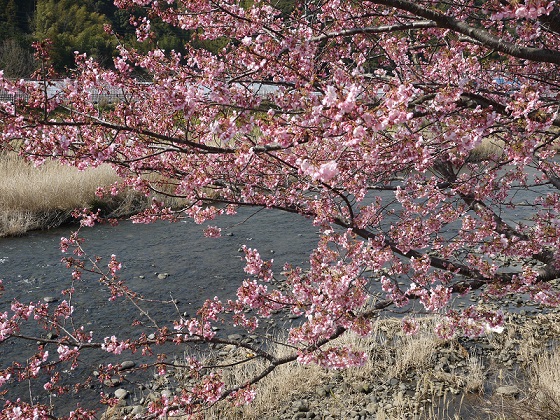 一度は見たいと思っていたサクラです。時期になると駅・パンフレット等に飾って有る写真では良く見るのですが実際に見た事が無かったので今回訪ねることにしました。車を駐車場に止め歩く事7分程度で川岸に到着、川を挟んで両側に河津桜がびっしりでした。