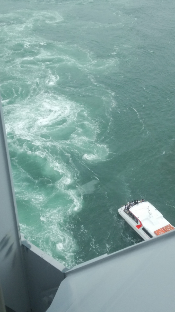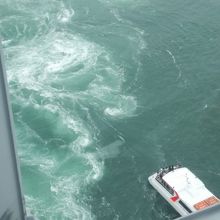 下をのぞくとガラス床から渦潮を間近に見ることができます。