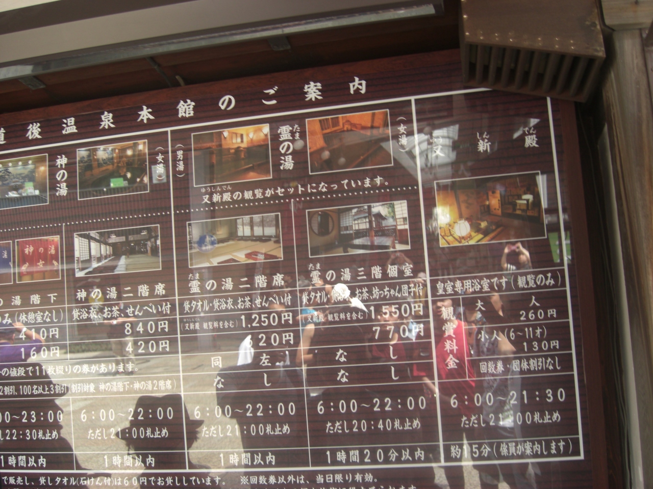もうクチコミされまくっていますが、道後温泉のほとんどの方の目的がここ。約400−1500円まで4種類の価格帯があります。ぼっちゃんの間は3階の奥にあります。一階が神の湯、2階が霊の湯です。時間指定があります。