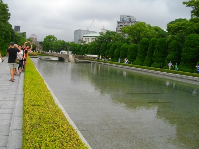 慰霊碑の後ろにある池です。いつも綺麗に保たれています。慰霊碑からこの池の直線上のところに原爆ドームがあります。付近には西側に「平和祈念像」「菩提樹の碑」、東側に「祈りの像」、北側に「平和の灯」などがあります。