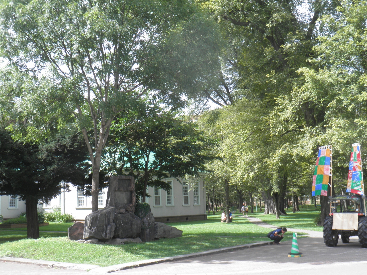 北海道大学の札幌キャンパスで8月下旬に開催された北大マルシェ2014に行ってきました。 天候もよくて、休日だったためか多くの観光客も訪れていました。 会場の入り口には、貴重な岩石でできている聖蹟碑があります。 ここには、農業用のトラクターが展示されていました。