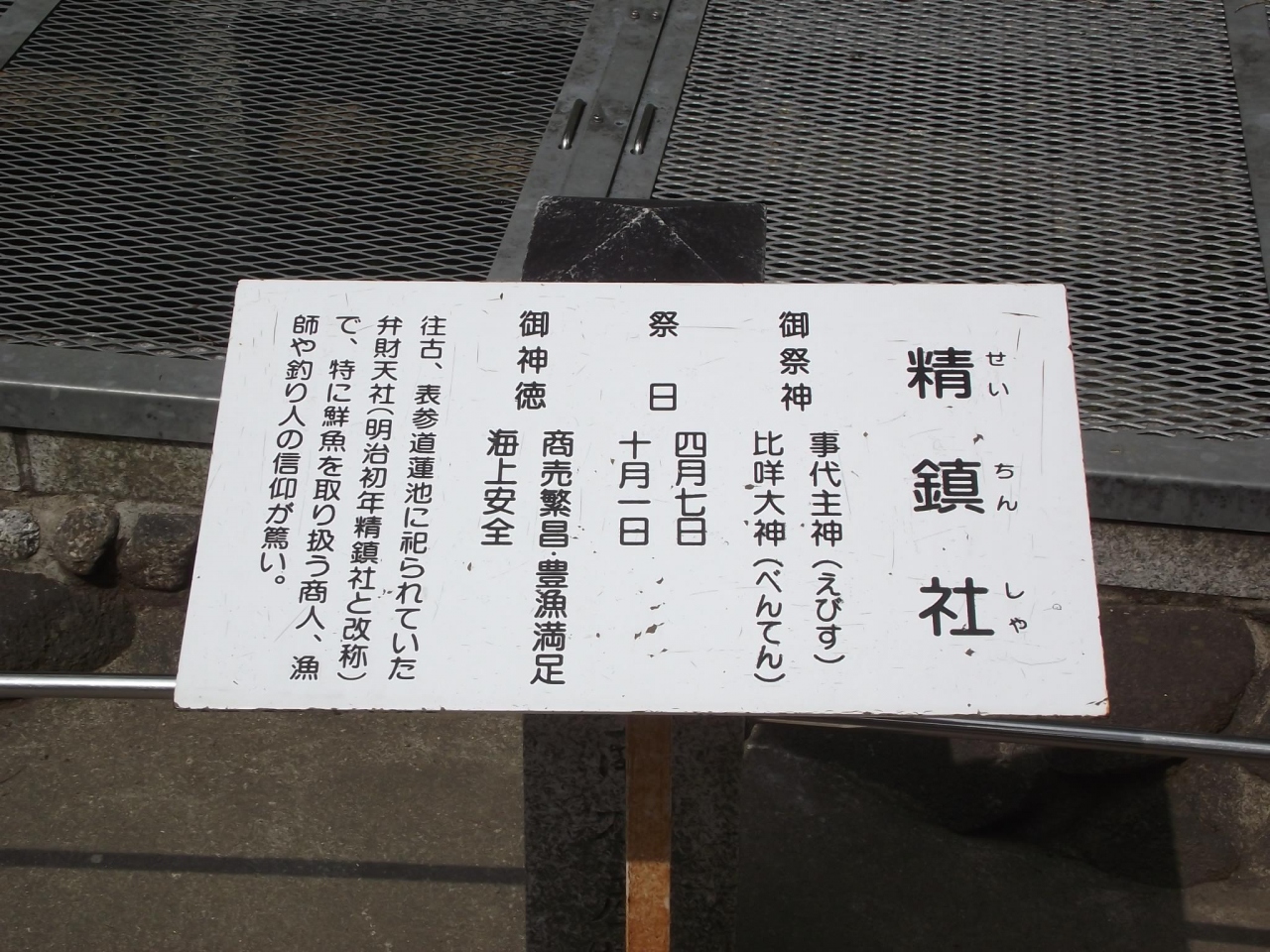 往古、表参道蓮池に祀られていた弁財天社 (明治初年精鎮社と改称) で、特に鮮魚を取り扱う商人、漁師や釣り人の信仰が篤い。
