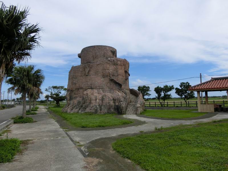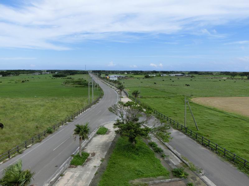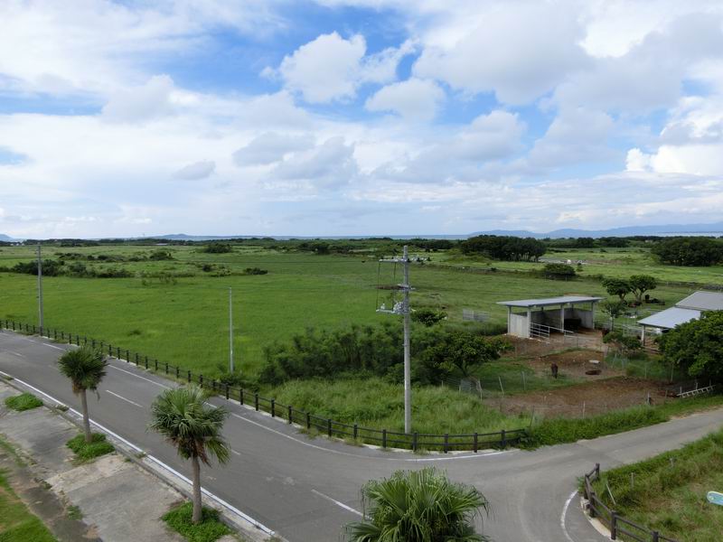 この展望台は黒島の内陸部にあり、海はほとんど見えません。見えるのは牧場と牛とすぐそばにある小中学校くらい。黒島は平坦で島を展望する場所がほとんどないので、通りがかったら上ってみるといいと思います。黒島港と東筋集落を結ぶ道路沿い、黒島小中学校の隣です。カラスがいることがあり、自転車のカゴに荷物を置いておくと狙われる可能性があるので注意してください。