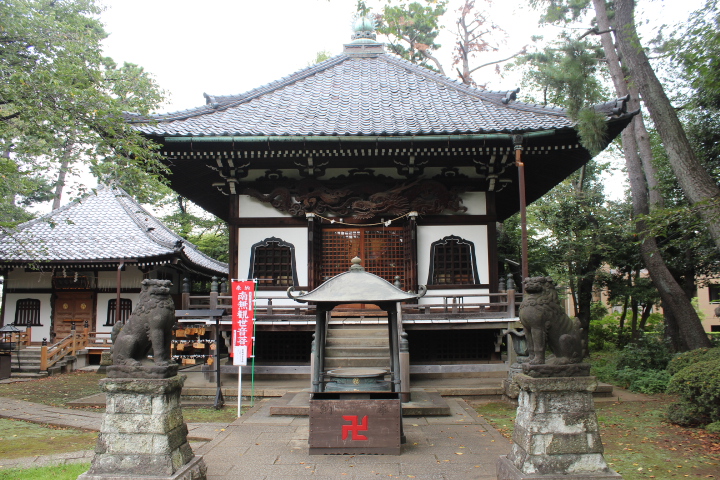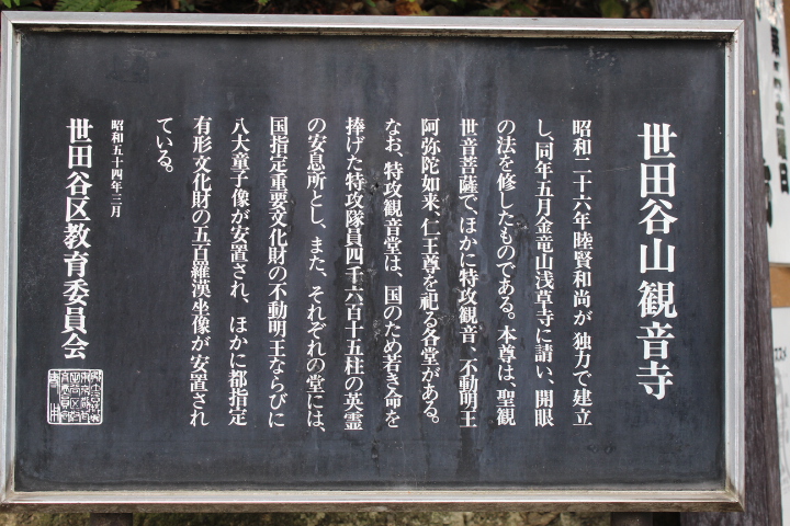 田園都市線三軒茶屋駅と東横線学芸大学駅の間辺りで明薬通り沿いに位置する昭和26年建立の比較的新しいお寺です。ご本尊は聖観世音菩薩ですが、そのほかに特攻観音、不動明王、阿弥陀如来像等がそれぞれのお堂に安置されています。仁王門の天井には鳴き竜もあります。