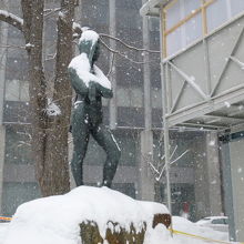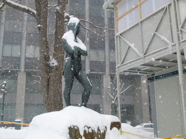 大通西3丁目付近にある湖風の像の作者の山田良定氏は滋賀大学名誉教授で1975年の日展で特選になった有名な作品です。清楚な青年の凛々しき姿は躍動感ある立像です。白銀の世界の中でよくわからないかも知れませんが、以前初夏のころにも訪ねたことがありますが、とても素晴らしい作品だと思います。