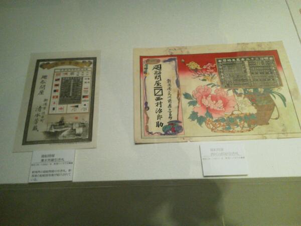 展示されていた引き札に大変興味をいだきました。いわゆるチラシなのですが、手のかかった作りでこれをもらえる事もステータスだったのかなと思いました。