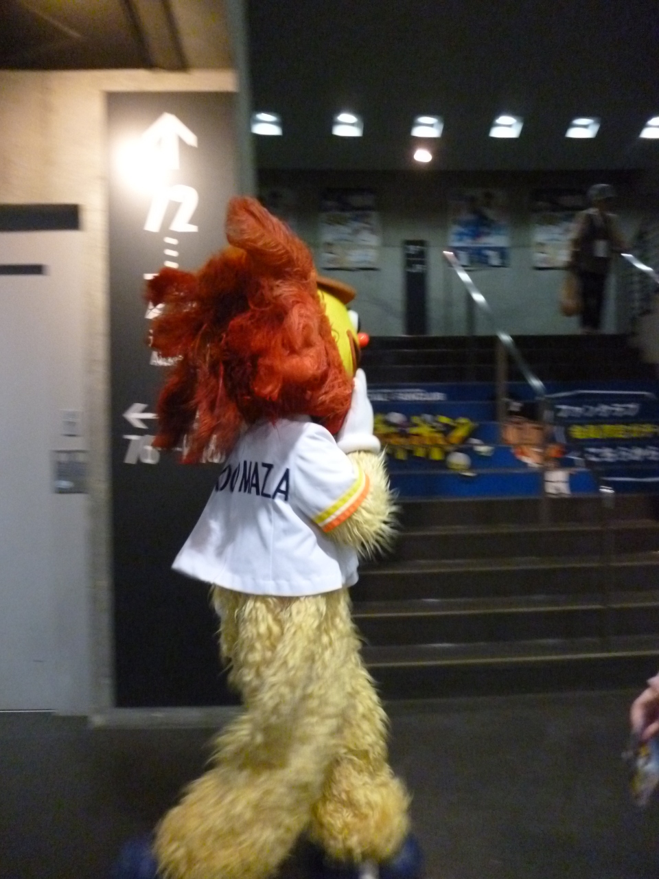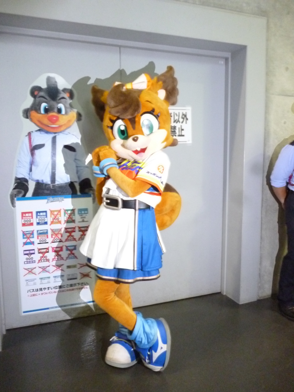 札幌ドームのファイターズ戦を見に行った時に、1階コンコースに、口がでかくてぎょろんとした目のキャラクターがいてにぎやかでした。野球の試合中、キャラクターは色んな場所を歩き回っているようです。ポリーもいて客にサービスしています。
