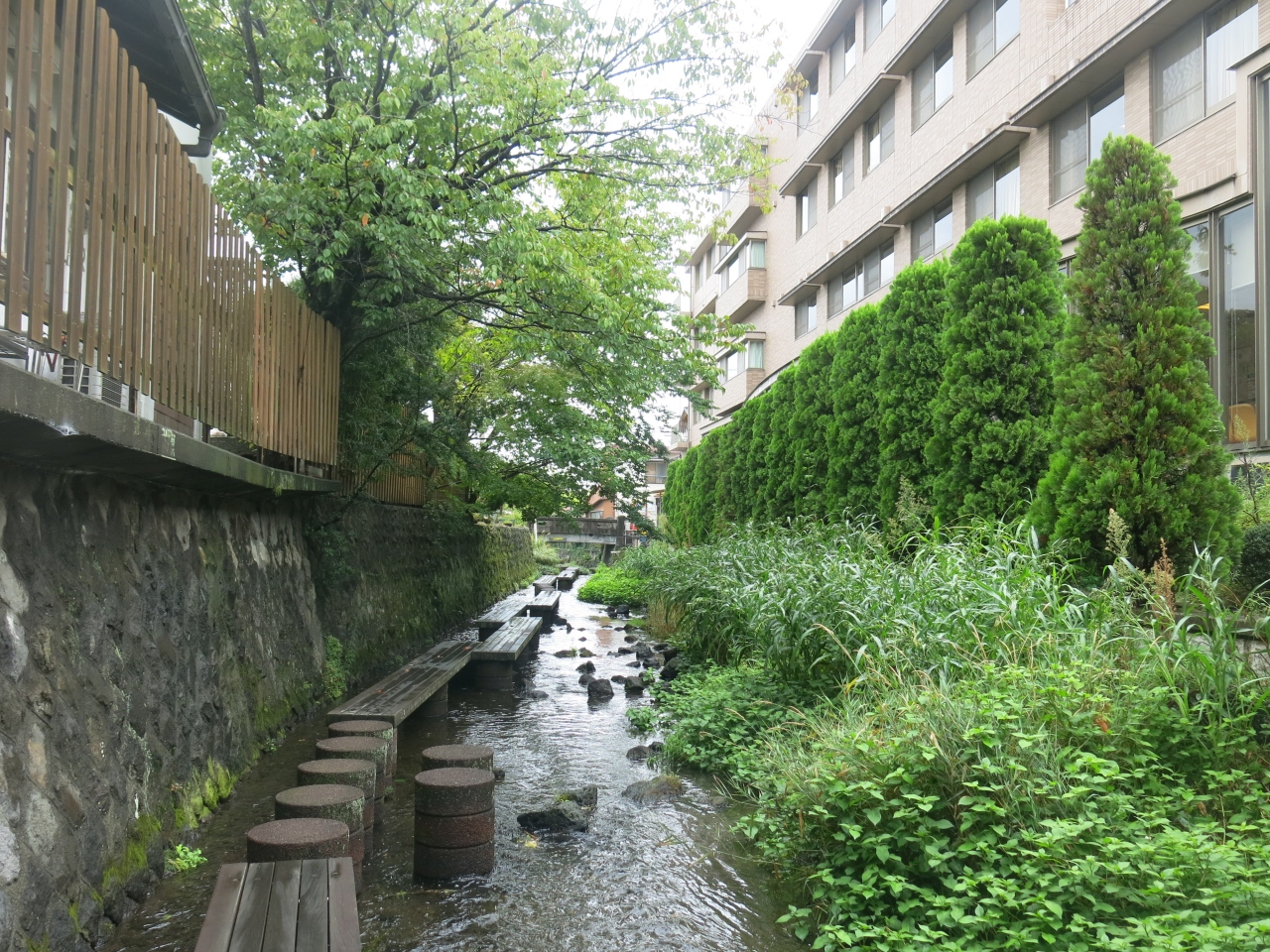 三島市内を流れる源兵衛川のなかに作られた飛び石上の散策路。浅瀬なので、靴を脱いで川のなかを歩いても膝下ぐらいです。暑い夏はせせらぎが気持ちいい。富士山の雪解け水を源流とする清流なので、蛍も生息しているようです。