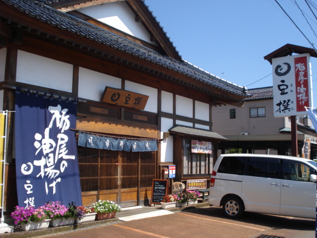 上杉謙信公に関わりのある栃尾城、今は長岡市に編入された旧栃尾市にあります。驚きなのですが、この辺りには油揚げを販売しているお店が沢山あります。その一つ「豆撰」さんへ立ち寄りました。店内には、椅子とテーブルが置いてあり、気軽に座って試食ができます。油揚げの前に、まずは豆腐、そして油揚げ、味付け2種類を頂きました。是非ともご賞味くださいませ。