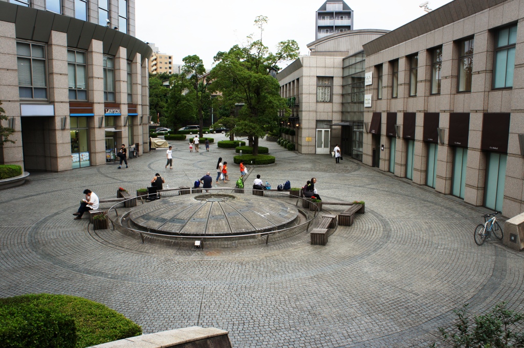 散歩の途中に通りがかったとき、東京ではよくある再開発ビルに見えました。オフィス用の高層ビル、中層のマンションに低層の商業施設。どこでも同じパターン。でも、高層ビル1階のコンビニに入ろうとして、中央の広場が広くてとても心地よさそうなことに気がつきました。真ん中に水が噴き出しそうな丸いオブジェがあり、その周囲にベンチ。建物と広場の色が統一され、ヨーロッパの都市部にあるちょっとした庭園を思わせます。無味乾燥な造りが多い再開発ビルの中で、外部の人も気兼ねなく入れる親しみが持てる雰囲気でした。