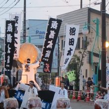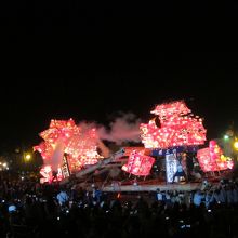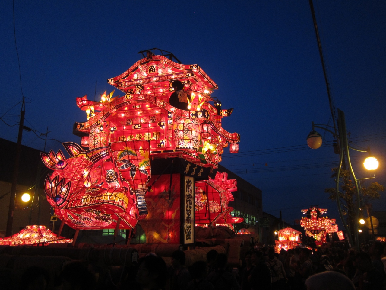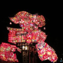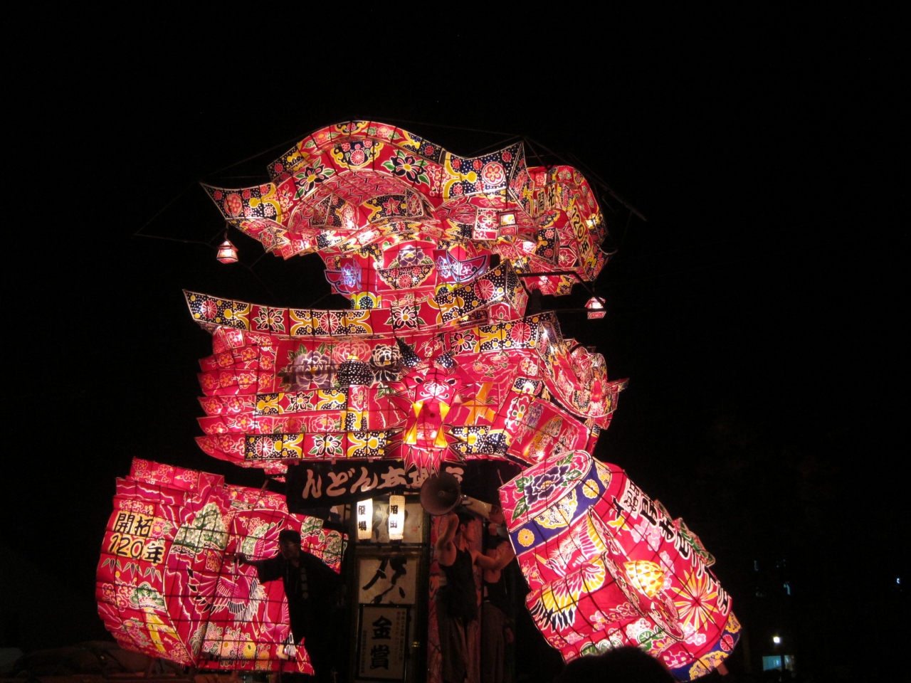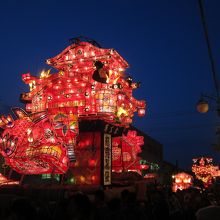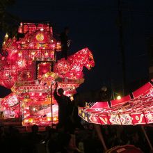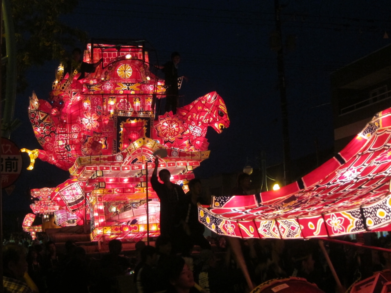 あんどんと言っても、提灯行列の祭りではなく、ねぶたに似た大きな明かりの灯った山車が、威勢のよいかけ声とともに街中を練り歩きます。ところどころで連の太鼓や夜高節の披露が行われます。