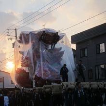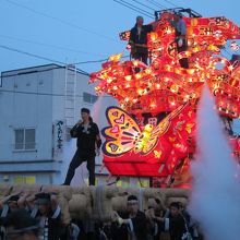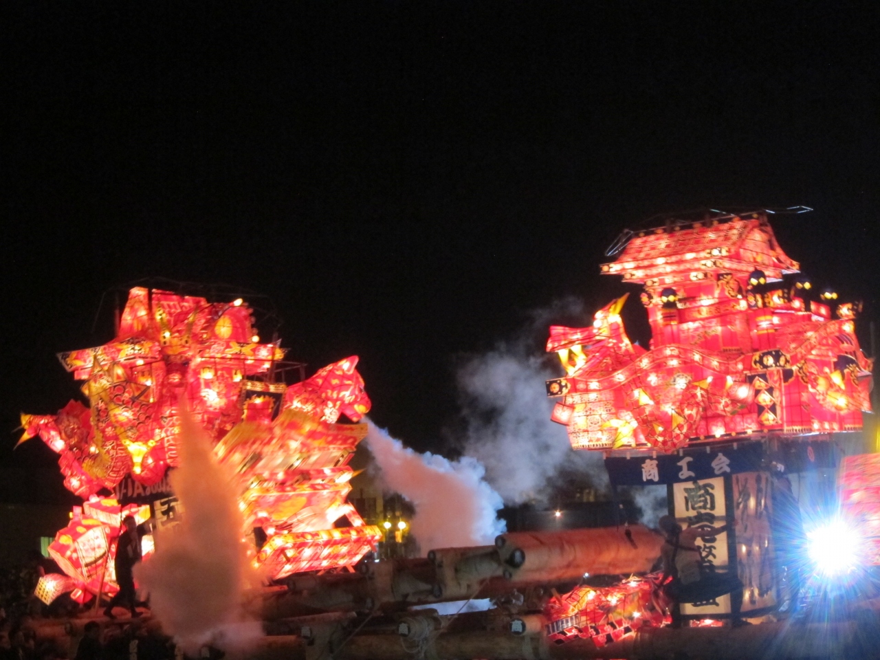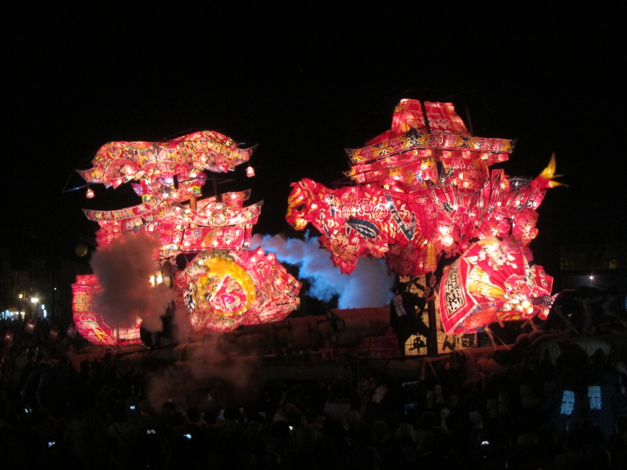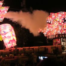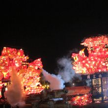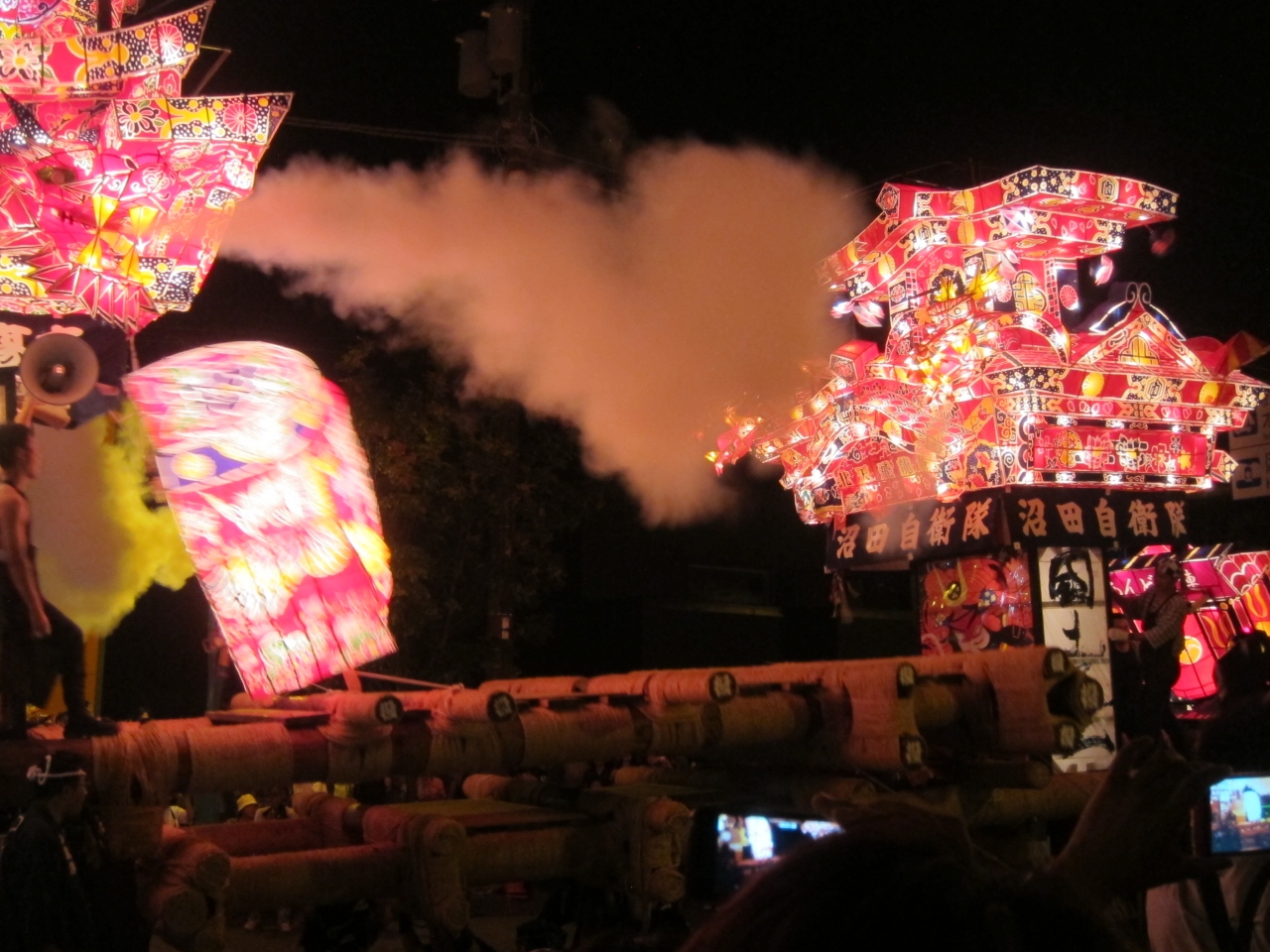 ヨイヤサーッ!というかけ声と共に、大きな山車(あんどん)が、ドライアイス?の煙を吐いて突進していきます。あんどんの前飾りは明かりが消え、めちゃくちゃに壊れてしまうほどです。