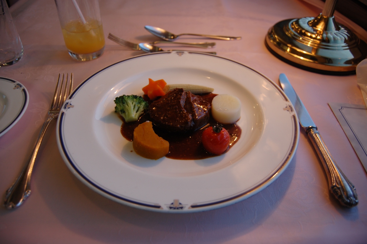 今回2回目の乗車となりました.前回同様上り列車に乗車しました.乗車後シャワーカードを買いに行ったらすでに大行列.シャワーカードを手に入れたいなら札幌駅では食堂車にいい番近い扉から乗ったほうがよさそうです.今回はフランス料理のコースを利用しました.料金は若干高めですがパブタイムのように混雑していたり時間を気にしたりしないで済むので優雅な時間を楽しめました.
