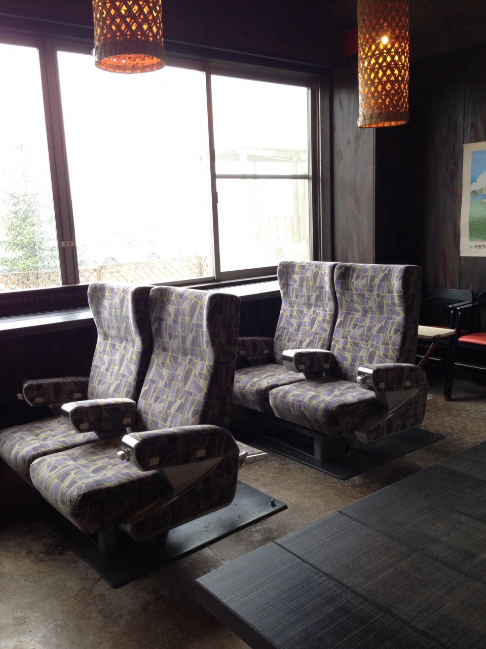 まわりは、キャンプ場にもなっているようですが、華やかな感じはなくひなびた雰囲気でした。廃車の電車がそとに置いてあります。温泉は鉄色で露天風呂も岩にかこまれたものでした。