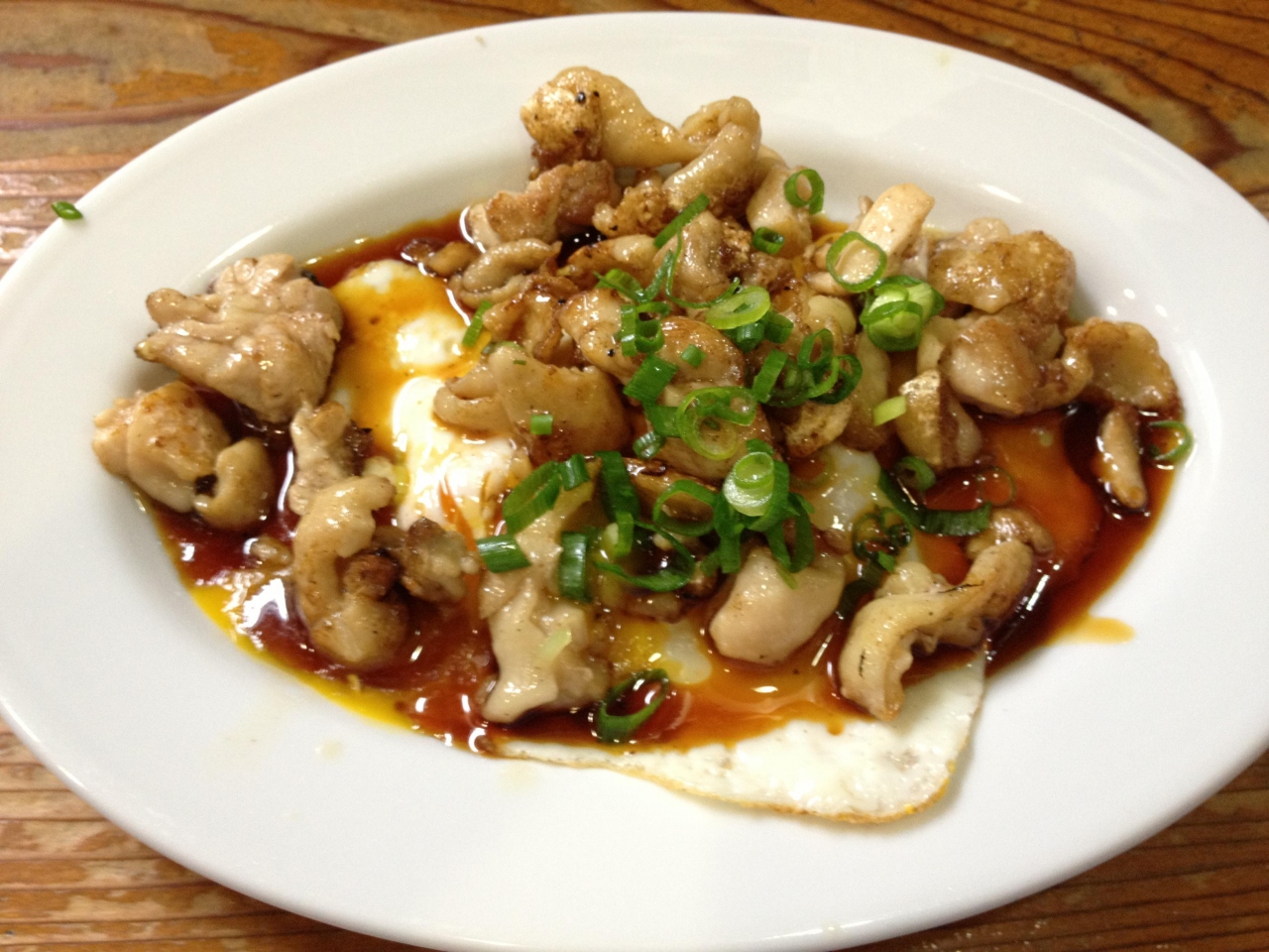 最初に飲み物とともに、「皮」でいいかと聞かれたのですがもともとこの「皮焼き」が雑誌に載っていて食べたかったので注文しました。卵の目玉焼きの上に焼いた皮が載っていて、それにたれがかかり、刻みネギが散らされています。タレは甘辛で美味しいです♪