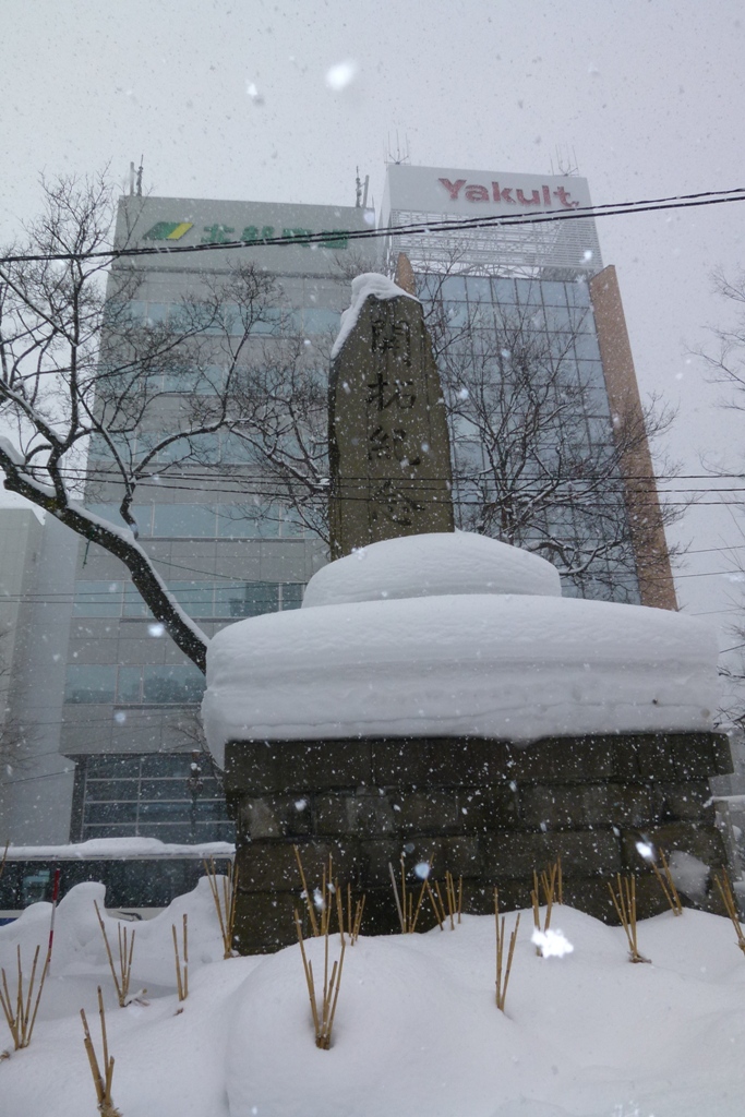 開拓記念碑は南区石山開拓神社境内にある石山戦後開拓20周年を記念に建立し、石碑裏に入植者の名が刻まれているものがありますが、大通公園内にもありました。雪が舞っていても当時の面影を残しつつ堂々していました。