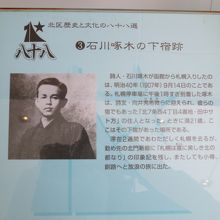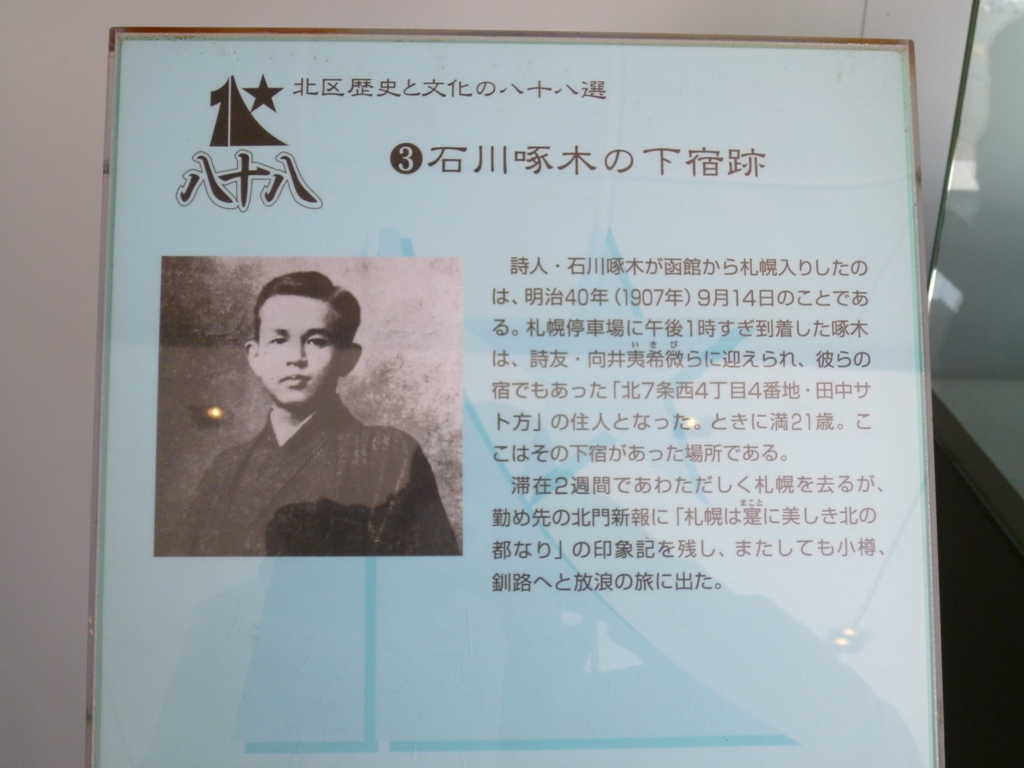 その昔、札幌にはクラーク博士・新渡戸稲造・有島武郎・石川啄木が居住していました。北区北7条西4丁目北大通りを探すとビルの一角のエントランスに石川啄木の像がガラスケースに収められ、横には案内板がありました。案内板には啄木が函館から札幌入りした出来事が綴られています。札幌滞在は慌ただしい2週間の滞在。札幌を去る時に「札幌は誠に美しき北の都なり」と残していますが、まさにその通りだと思います。啄木の優しい気持ちがうかがい知ることができました。