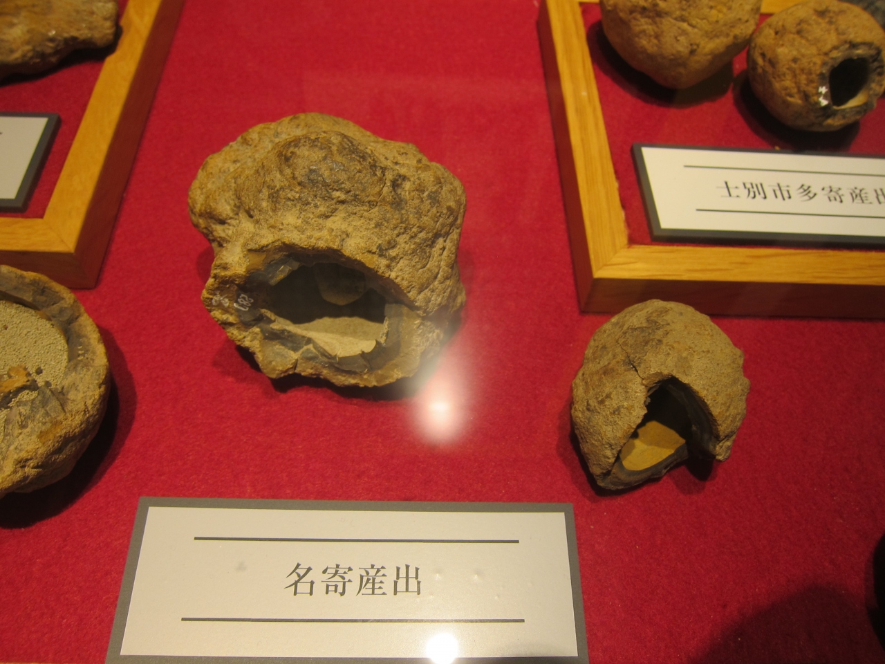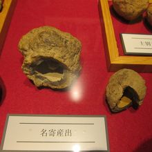 名寄では全国でも限られた場所にしか産出しない鈴石がとれます。石の中に石が入っていて、カラカラと音がします。産出場所では展示はありませんし、採取は禁止。ここ、北国博物館で見ることができます。更に実物に触って、振ってみることもできます。カラカラとかシャカシャカという音がしました。また、高師小僧という石も採れるようで、こちらも同箇所に展示してありました。