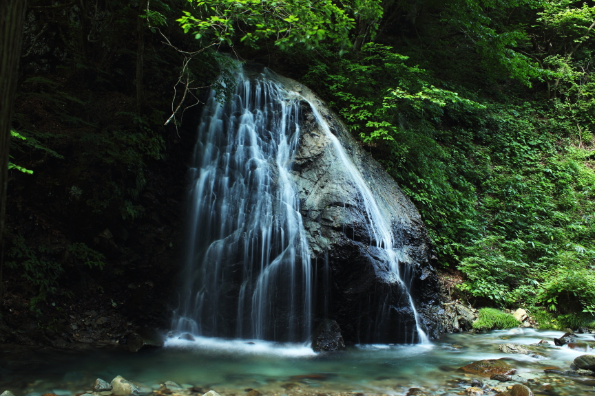 馬尾滝は勢至堂渓谷の一つで、道路際に駐車する場所があり、降りてすぐに見れる滝。落差12mで対岸から観ることが出来る。岩を滑り落ちる滝はとても綺麗。陽の光が微妙に差し込むので滝の見え方がいろいろ楽しめると思う。