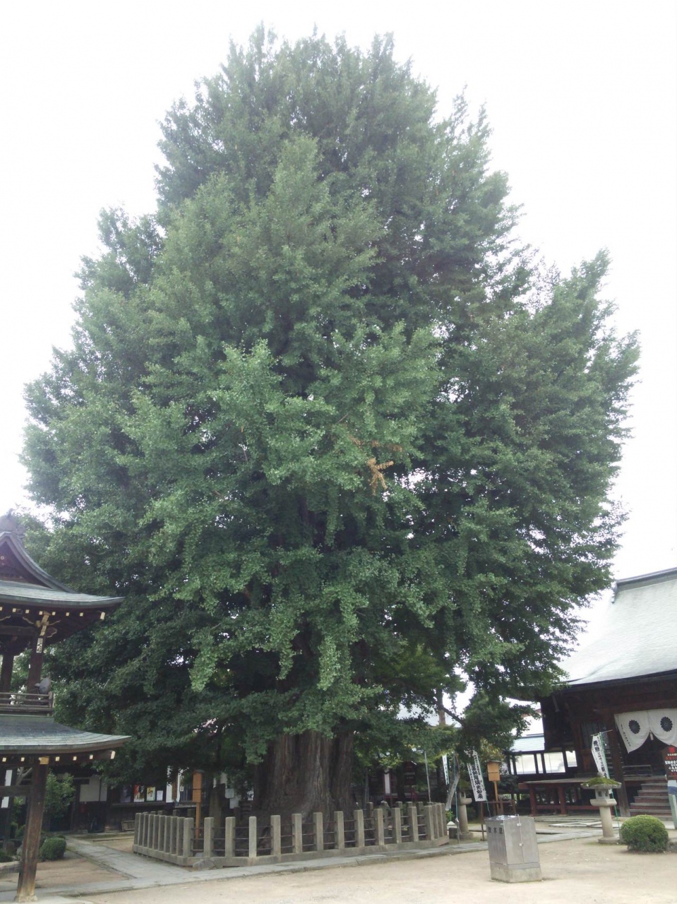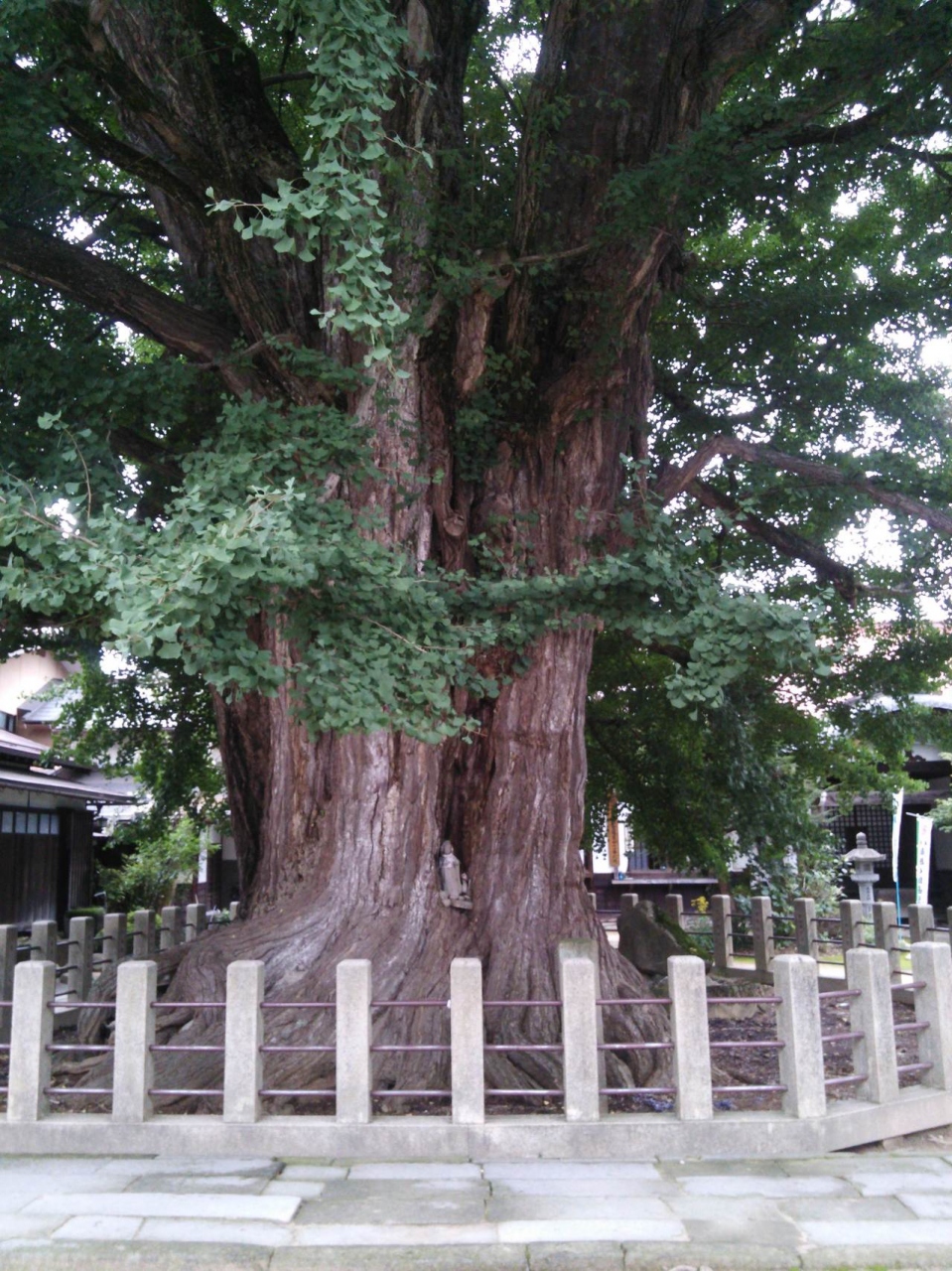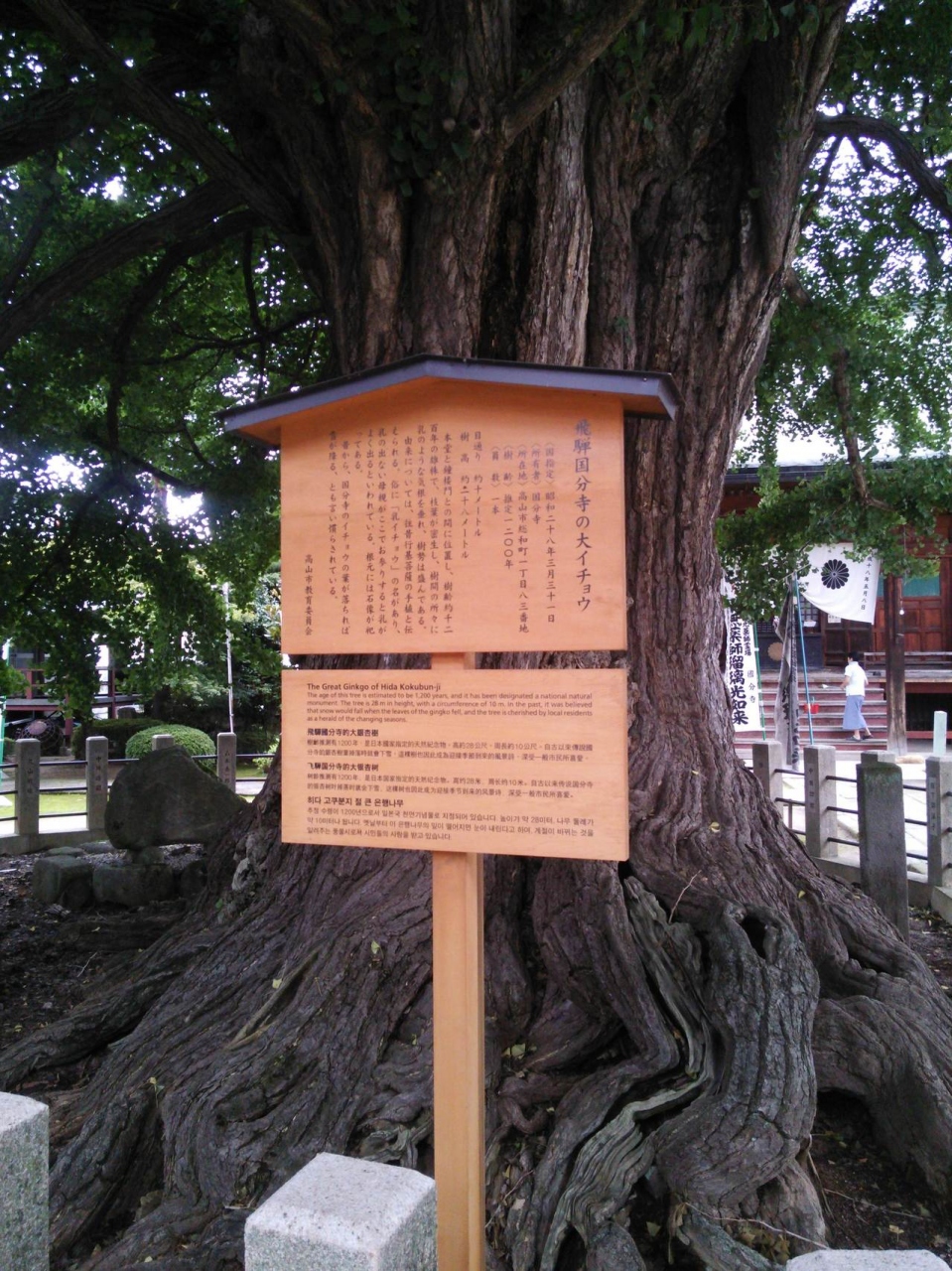 飛騨国分寺の境内に、巨大なイチョウの大木があります。樹齢は1200年を超えるともいわれ、高さは28メートルもあり、国の天然記念物に指定されている木だそうです。
