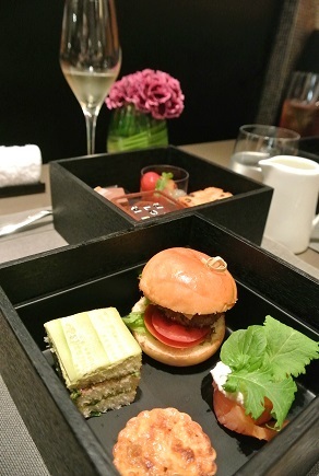 お重になってて一段目はミニバーガーとかサンドイッチとかキッシュ