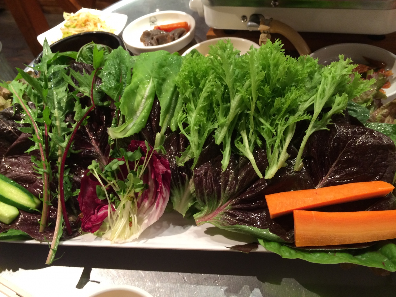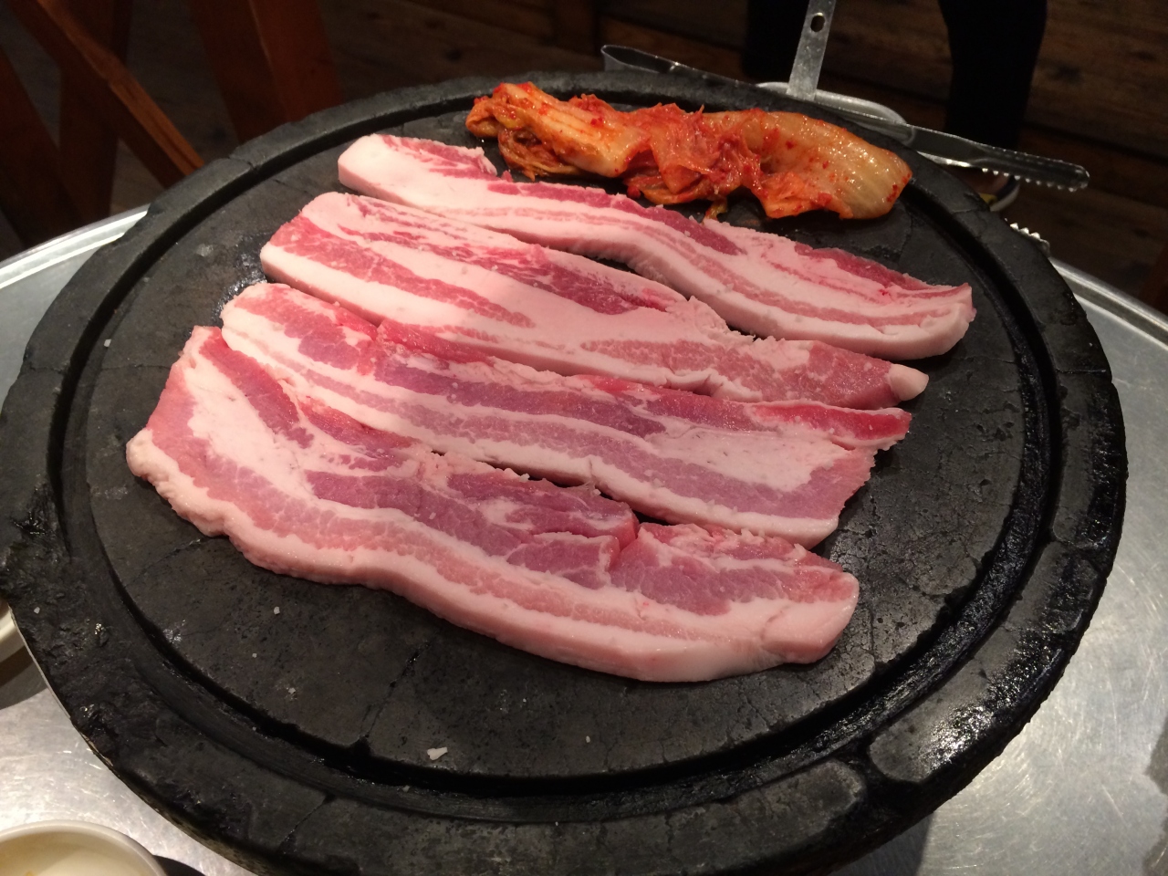 5年ぶりに友人と来店。サムギョプサル野菜セット(1,580円)をお願いしました。分厚いサムギョプサルに焼キムチ、大量の野菜、カクテキ、テンジャン、薬味類が付いてきます。ここは韓国人の店員が焼いてくれるのですが、なるほど、けっこうカラカラになるまで焼くものなのですね。これで余分な脂肪が外に流れ出ます。キムチやネギやテンジャンとサンチュに包んで食べると、もうたまらない美味さ。